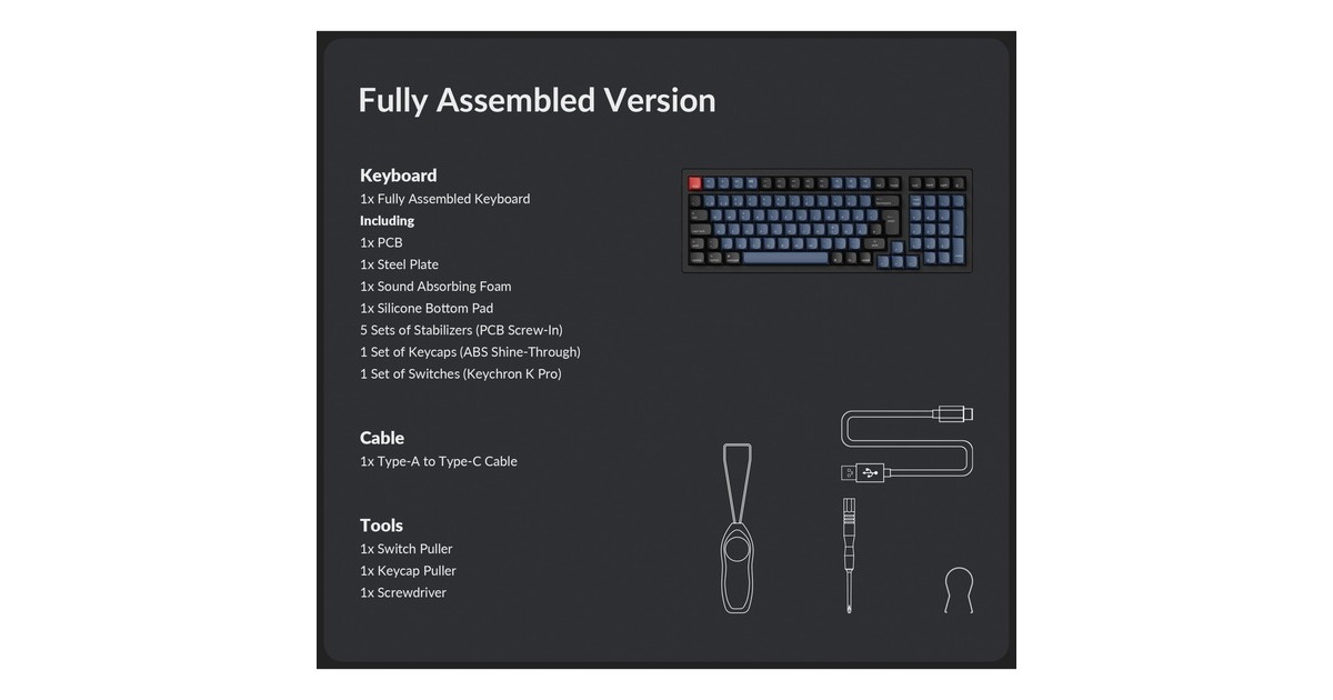 ISO-DE-Layout | Vollständig montierte Tastatur inkl. Aluminiumrahmen, PCB, Stahlplatte, schalldämmender Schaumstoff, Silikon-Bodenpolster, 5 Sets an Stabilisatoren (eingeschraubt), 1 Set an ABS-Tastenkappen, 1 Set an Keychron K Pro Schaltern | Wiederaufladbare 4000 mAh Li-Polymer-Batterie | Akkulaufzeit: Bis zu 300 Stunden bei ausgeschalteter Hintergrundbeleuchtung, bis zu 100 Stunden bei eingeschalteter Hintergrundbeleuchtung | Bluetooth-Version: 5.1 | Polling-Rate Bluetooth: 90 Hz | Polling-Rate USB-Kabel: 1.000 Hz |