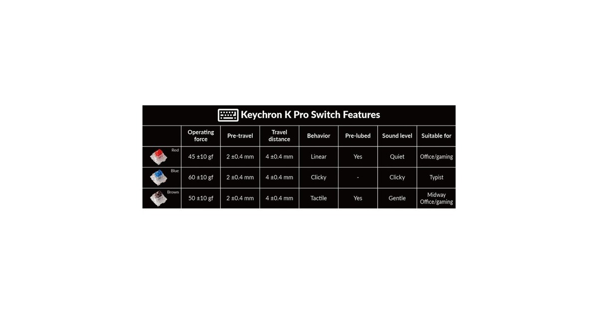 ISO-DE-Layout | Vollständig montierte Tastatur inkl. Aluminiumrahmen, PCB, Stahlplatte, schalldämmender Schaumstoff, Silikon-Bodenpolster, 3 Sets an Stabilisatoren (eingeschraubt), 1 Set an ABS-Tastenkappen, 1 Set an Keychron K Pro Schaltern | Wiederaufladbare 4000 mAh Li-Polymer-Batterie | Akkulaufzeit: Bis zu 300 Stunden bei ausgeschalteter Hintergrundbeleuchtung, bis zu 100 Stunden bei eingeschalteter Hintergrundbeleuchtung | Bluetooth-Version: 5.1 |