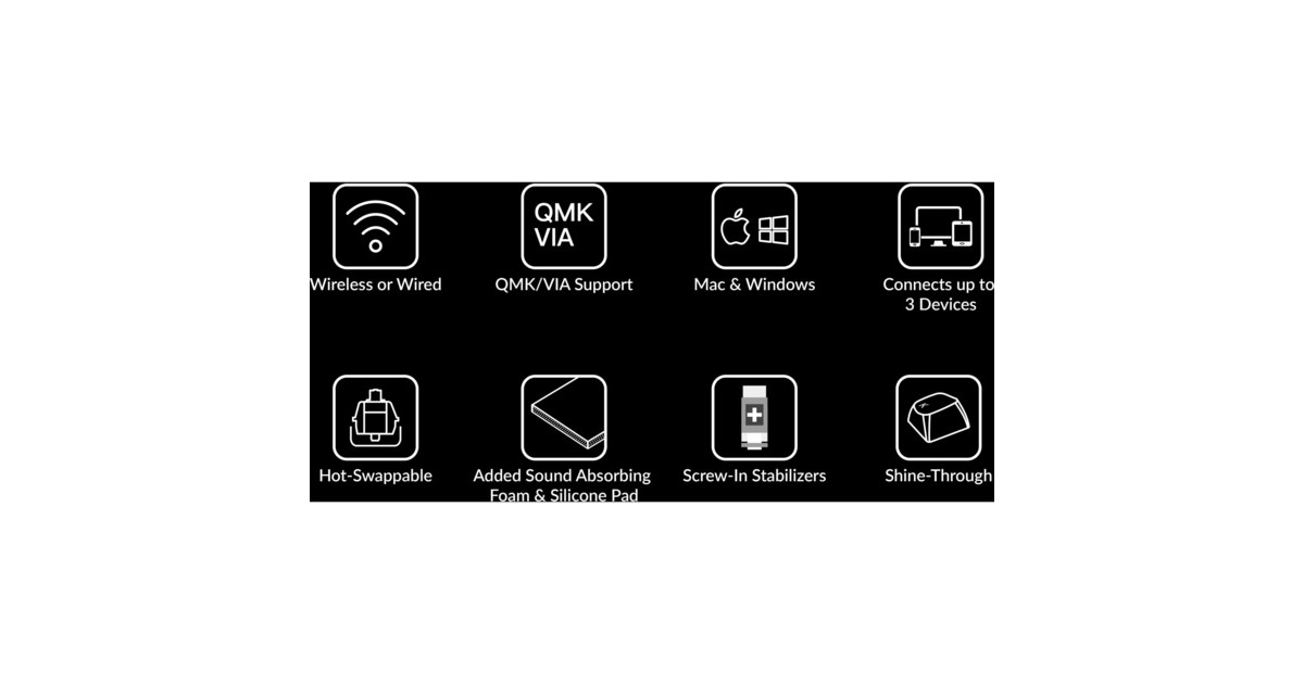 Nach Süden ausgerichtete RGB-Hintergrundbeleuchtung mit 19 Beleuchtungsmodi | Verbindung mit bis zu 3 Geräten | ABS-Tastenkappen | Eingeschraubte PCB-Stabilisatoren| Vollständige QMK- und VIA-Unterstützung | OSA-Tastenkappen-Profil (OEM-Profil mit sphärischem Winkel) | Tippwinkel: 3,5º, 8,5º und 12º | Aluminiumrahmen |