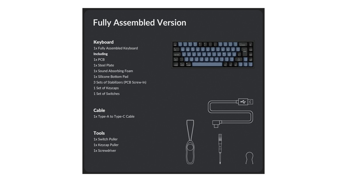 ISO-DE-Layout | Vollständig montierte Tastatur inkl. Aluminiumrahmen, PCB, Stahlplatte, schalldämmender Schaumstoff, Silikon-Bodenpolster, 3 Sets an Stabilisatoren (eingeschraubt), 1 Set an ABS-Tastenkappen, 1 Set an Keychron K Pro Schaltern | Wiederaufladbare 4000 mAh Li-Polymer-Batterie | Akkulaufzeit: Bis zu 300 Stunden bei ausgeschalteter Hintergrundbeleuchtung, bis zu 100 Stunden bei eingeschalteter Hintergrundbeleuchtung | Bluetooth-Version: 5.1 |