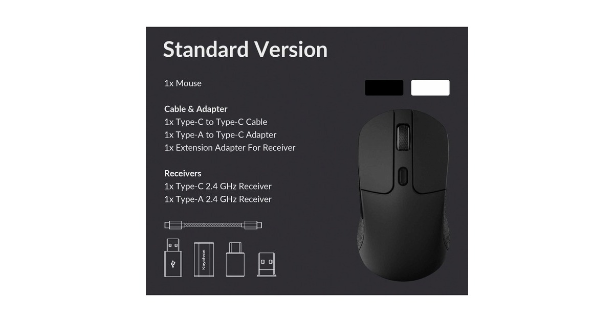 1x USB-C-auf-USB-C-Kabel, 1x USB-A-auf-USB-C-Adapter, 1x Adapterverlängerung für Empfänger, 1x 2,4-GHz-USB-C-Empfänger, 1x 2,4-GHz-USB-A-Empfänger |