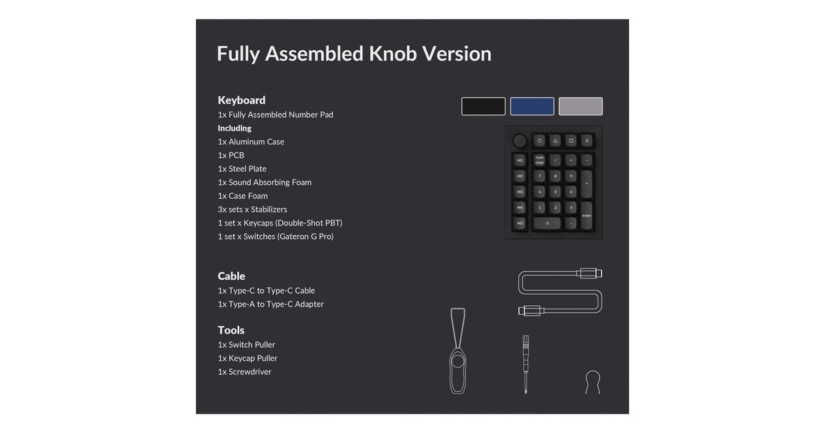Number Pad Kit (vollständig montiert): Aluminiumrahmen, PCB, Stahlplatte, schalldämmender Schaumstoff, Gehäuse Schaumstoff (vorinstalliert), 3 Sets an Stabilisatoren, 1 Set an Double-Shot-PBT-Tastenkappen, 1 Set an Gateron G Pro Brown Schaltern |