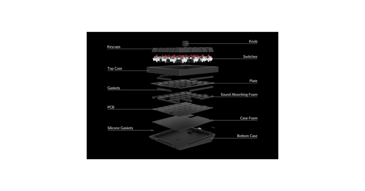 Gateron G Pro Red Schalter (taktil, 45 g Auslösedruck, 2 mm Auslöseweg, 4 mm bis Anschlag), Double-Shot-PBT-Tastenkappen (nicht durchscheinend), Hot-Swap-fähig, Aluminiumrahmen (6063 Aluminium, CNC-gefräst, poliert, eloxiert, sandgestrahlt), eingeschraubte PCB-Stabilisatoren, Arm Cortex-M4 32-Bit STM32L432 mit extrem niedrigem Stromverbrauch (128KB Flash), vollständige QMK- und VIA-Unterstützung |