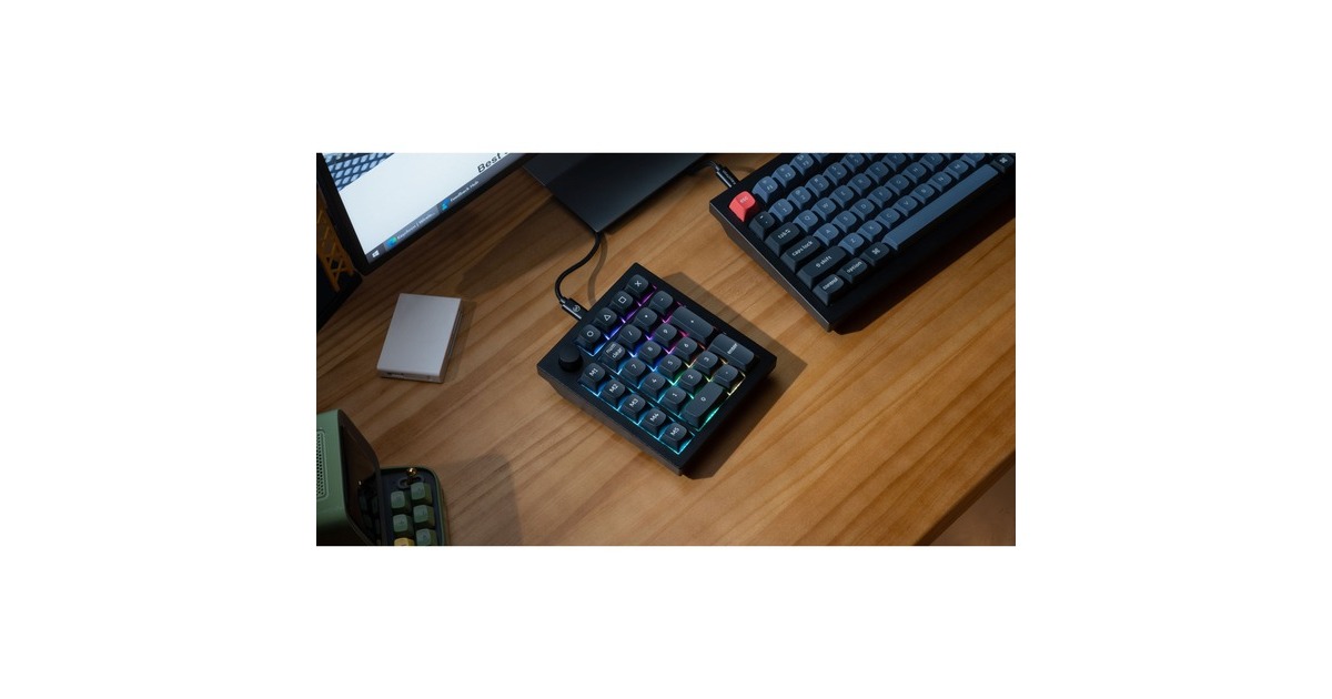 Der Keychron Q0+ ist ein vollständig anpassbarer Mini-Ziffernblock, der als Ziffernblock oder als zusätzlicher Makrotastensatz verwendet werden kann. Sein Metallgehäuse besteht aus 6063-Aluminium, das mit CNC-Maschinen bearbeitet, poliert, eloxiert und sandgestrahlt wird und 24 weitere Fertigungsschritte durchläuft, um das Q0+ zu einem wunderschön gestalteten Gadget für den Schreibtisch zu machen. Die Hot-Swap-fähigen Sockel sind auf der Platine montiert, sodass Schalter ohne Löten installiert oder gewechselt werden können. Die Platine unterstützt sowohl 3-polige als auch 5-polige mechanische Schalter im MX-Stil. Das Einschraubdesign der PCB-Stabilisatoren erhöht die Stabilität und erleichtert Änderungen und Upgrades. Die nach Süden ausgerichteten RGB-LEDs sind so konzipiert, dass die Hintergrundbeleuchtung des Ziffernblocks aus dem Blickwinkel des Tippers besser zur Geltung kommt, wenn hochwertige, nicht durchscheinende PBT-Tastenkappen installiert sind. Die RGB-Beleuchtung ist dadurch auch frei von Interferenzen, wenn alternative Cherry-Tastenkappen installiert werden. Dank vollständiger QMK- und VIA-Unterstützung lässt sich jede Taste auf des Q0+ ganz einfach programmieren und neu belegen. Die Open-Source-Firmware bietet endlose Möglichkeiten für Tastenkombinationen, Hintergrundbeleuchtungseffekte und mehr. Eine ARM Cortex-M4 32-Bit-STM32L432-MCU mit extrem geringem Stromverbrauch, die leistungsstark und mit 128K Flash ausgestattet ist, bietet Entwicklern dabei mehr Flexibilität. Der Q0+-Barebone ist außerdem links oben mit einem Drehregler-Knopf ausgestattet. Art.-Nr.: 1900302