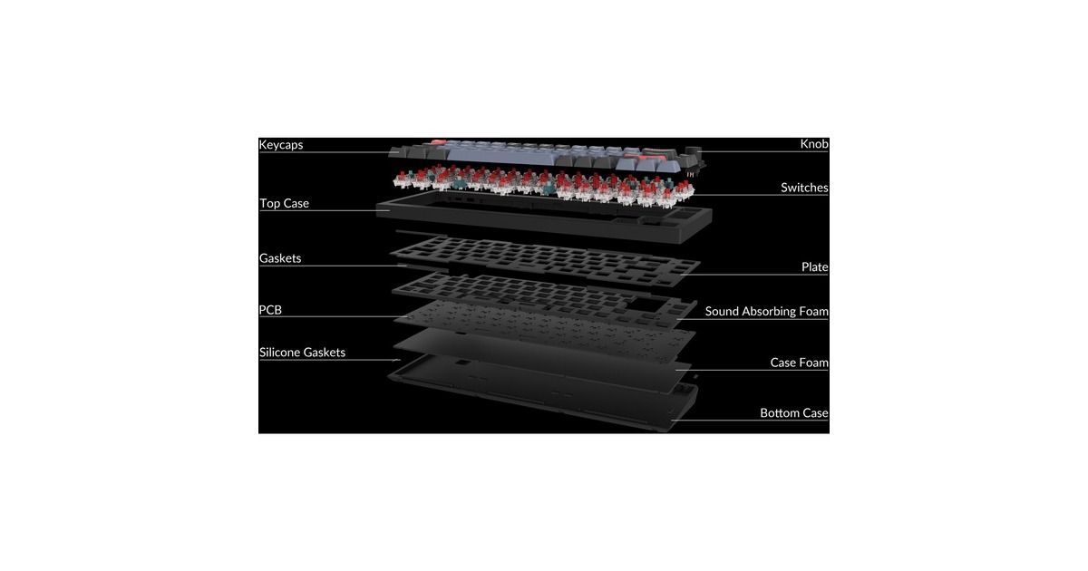 Vollständig montierte Tastatur inkl. Aluminiumrahmen, PCB, Stahlplatte, schalldämmender Schaumstoff, Gehäuseschaumstoff, 12 Gaskets (8 vorinstalliert, 4 zusätzlich), 3 Sets an Stabilisatoren, Drehregler, 1 Set ABS-Tastenkappen und 1 Set Gateron G Pro Tastenschalter (vorgeölt) |