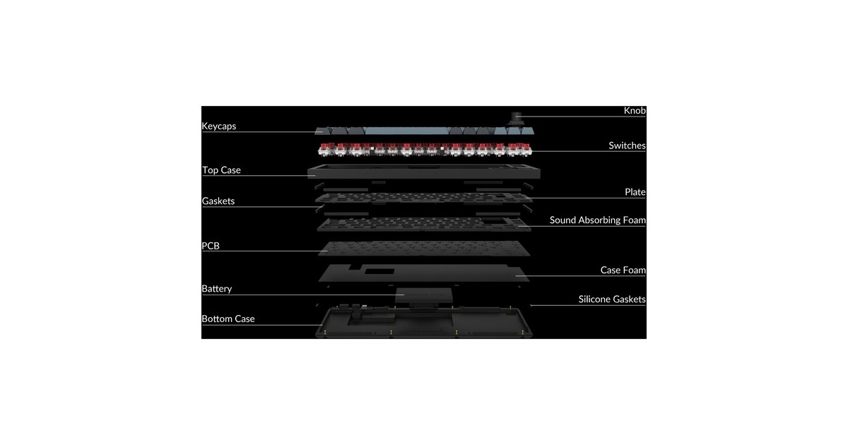 Aluminiumrahmen (6063 Aluminium, CNC-gefräst, poliert, eloxiert, sandgestrahlt) | durchscheinende ABS-Tastenkappen mit OSA-Profil (OEM-Höhe, SA-Form) | Programmierbarer Drehregler | Nach Süden ausgerichtete RGB-LEDs | Eingeschraubte PCB-Stabilisatoren | Vollständige QMK- und VIA-Unterstützung | macOS-Windows-Umschalter |