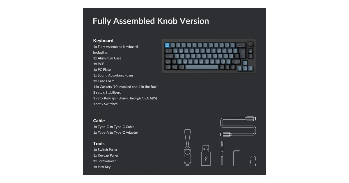 DE-ISO-Layout | Vollständig montierte Tastatur inkl. Aluminiumrahmen, PCB, PC-Platte, schalldämmender Schaumstoff, Gehäuseschaumstoff, 14 Gaskets (10 vorinstalliert, 4 zusätzlich), 3 Sets an Stabilisatoren, 1 Set ABS-Tastenkappen (durchscheinend) und 1 Set Keychron K Pro Tastenschalter (vorgeschmiert) | Wiederaufladbarer 4000 mAh Li-Polymer-Akku | Akkulaufzeit: 300 Stunden bei ausgeschalteter Hintergrundbeleuchtung, 100 Stunden bei eingeschalteter Hintergrundbeleuchtung (geringste Helligkeit) | Bluetooth-Version: 5.1 | Polling-Rate Bluetooth: 90 Hz | Polling-Rate USB-Kabel: 1.000 Hz |