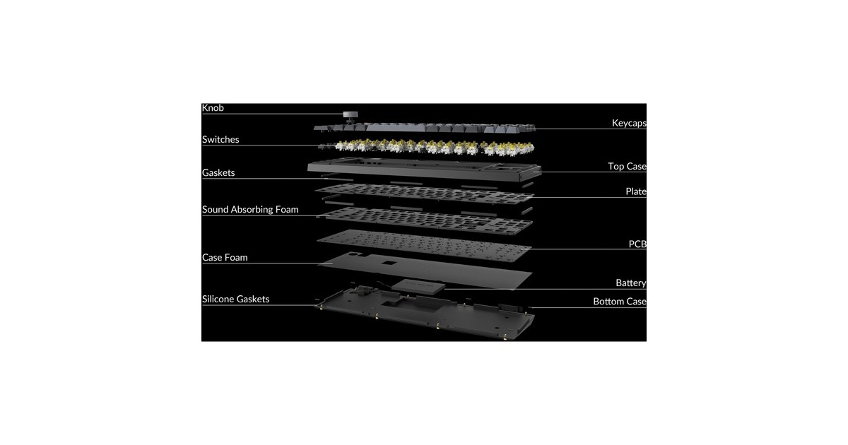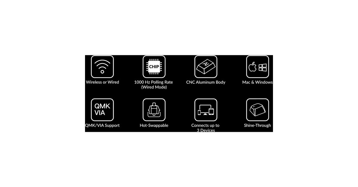 Aluminiumrahmen (6063 Aluminium, CNC-gefräst, poliert, eloxiert, sandgestrahlt) | durchscheinende ABS-Tastenkappen mit OSA-Profil (OEM-Profil mit sphärischem Winkel) | Programmierbarer Drehregler | Zusätzliche anpassbare Tasten auf der linken Seite | Nach Süden ausgerichtete RGB-LEDs | Eingeschraubte PCB-Stabilisatoren | Vollständige QMK- und VIA-Unterstützung | macOS-Windows-Umschalter |