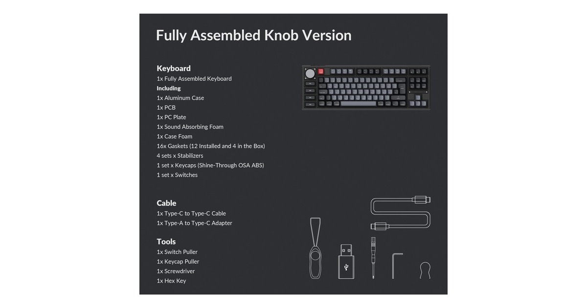 DE-ISO-Layout | Vollständig montierte Tastatur inkl. Aluminiumrahmen, PCB, PC-Platte, schalldämmender Schaumstoff, Gehäuseschaumstoff, 16 Gaskets (12 vorinstalliert, 4 zusätzlich), 4 Sets an Stabilisatoren, Drehregler, 1 Set ABS-Tastenkappen und 1 Set Keychron K Pro Tastenschalter (vorgeölt) | Wiederaufladbarer 4000 mAh Li-Polymer-Akku | Akkulaufzeit: Bis zu 300 Stunden bei ausgeschalteter Hintergrundbeleuchtung, bis zu 100 Stunden bei eingeschalteter Hintergrundbeleuchtung | Bluetooth-Version: 5.1 | Polling-Rate Bluetooth: 90 Hz | Polling-Rate USB-Kabel: 1.000 Hz |