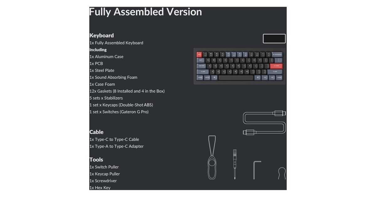 Vollständig montierte Tastatur inkl. Aluminiumrahmen, PCB, Stahlplatte, schalldämmender Schaumstoff, Gehäuseschaumstoff, 12 Gaskets (8 vorinstalliert, 4 zusätzlich), 5 Sets an Stabilisatoren, 1 Set ABS-Tastenkappen und 1 Set Gateron G Pro Tastenschalter (vorgeölt) |