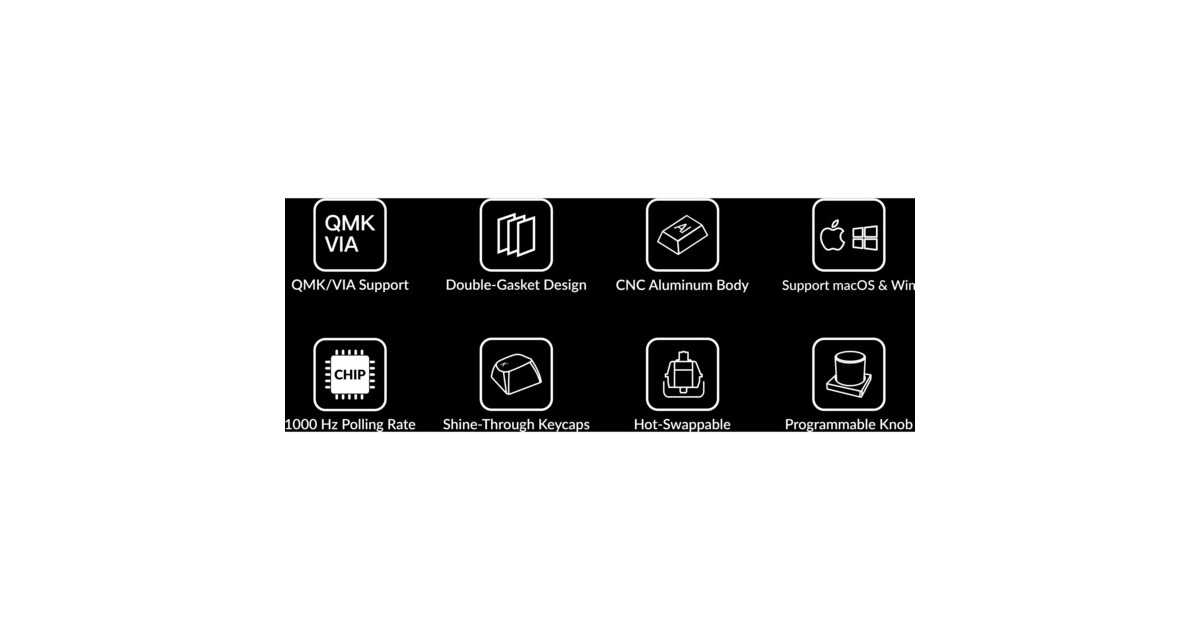 Aluminiumrahmen (6063 Aluminium, CNC-gefräst, poliert, eloxiert, sandgestrahlt) | ABS-Tastenkappen mit OSA-Profil (OEM-Höhe, SA-Form) | Programmierbarer Drehregler | Nach Süden ausgerichtete RGB-LEDs | Eingeschraubte PCB-Stabilisatoren | Vollständige QMK- und VIA-Unterstützung | macOS-Windows-Umschalter |