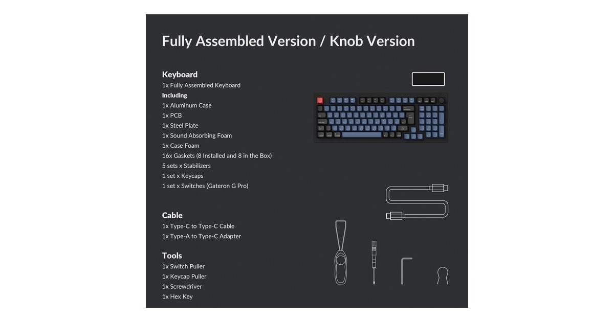Vollständig montierte Tastatur inkl. Aluminiumrahmen, PCB, Stahlplatte, schalldämmender Schaumstoff, Gehäuseschaumstoff, 16 Gaskets (8 vorinstalliert, 8 zusätzlich), 5 Sets an Stabilisatoren, Drehregler, 1 Set ABS-Tastenkappen und 1 Set Gateron G Pro Tastenschalter (vorgeölt) |