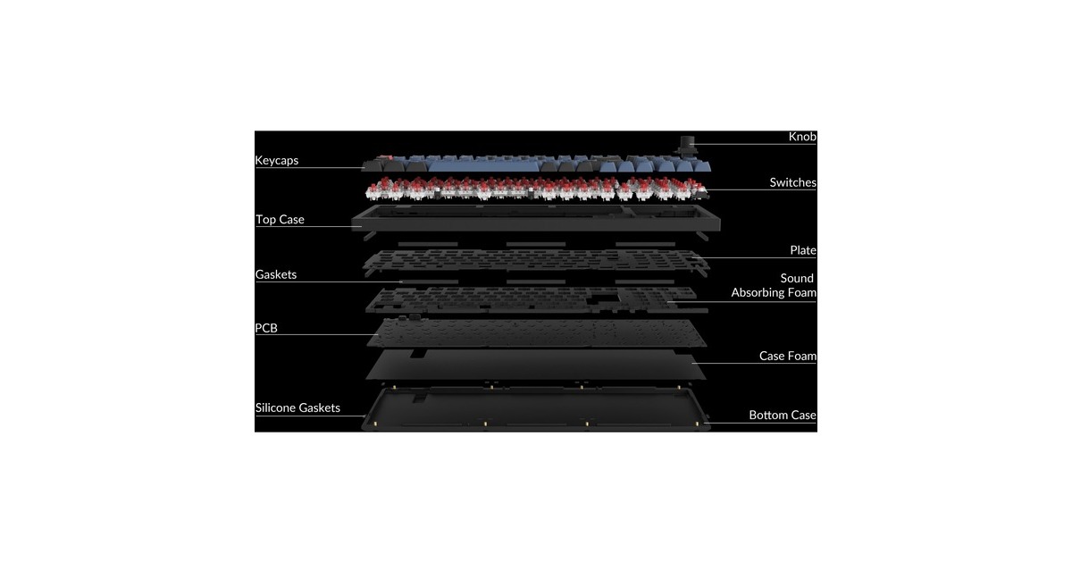 Vollständig montierte Tastatur inkl. Aluminiumrahmen, PCB, Stahlplatte, schalldämmender Schaumstoff, Gehäuseschaumstoff, 16 Gaskets (8 vorinstalliert, 8 zusätzlich), 5 Sets an Stabilisatoren, Drehregler, 1 Set ABS-Tastenkappen und 1 Set Gateron G Pro Tastenschalter (vorgeölt) |