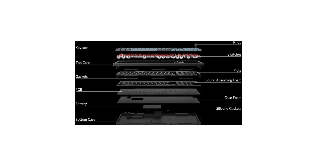 Aluminiumrahmen (6063 Aluminium, CNC-gefräst, poliert, eloxiert, sandgestrahlt) | durchscheinende ABS-Tastenkappen mit OSA-Profil (OEM-Profil mit sphärischem Winkel) | Programmierbarer Drehregler | Zusätzliche anpassbare Tasten auf der linken Seite | Nach Süden ausgerichtete RGB-LEDs | Eingeschraubte PCB-Stabilisatoren | Vollständige QMK- und VIA-Unterstützung | macOS-Windows-Umschalter |