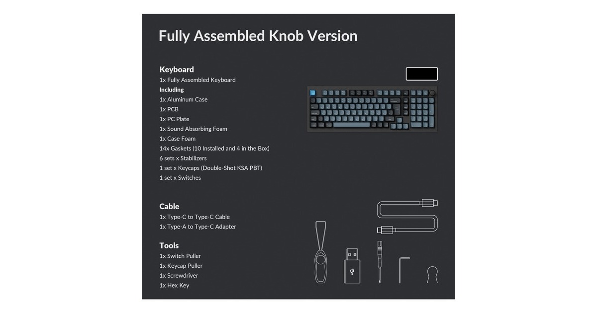 DE-ISO-Layout | Vollständig montierte Tastatur inkl. Aluminiumrahmen, PCB, PC-Platte, schalldämmender Schaumstoff, Gehäuseschaumstoff, 14 Gaskets (10 vorinstalliert, 4 zusätzlich), 6 Sets an Stabilisatoren, Drehregler, 1 Set ABS-Tastenkappen und 1 Set Keychron K Pro Tastenschalter (vorgeschmiert) | Wiederaufladbarer 4000 mAh Li-Polymer-Akku | Akkulaufzeit: Bis zu 300 Stunden bei ausgeschalteter Hintergrundbeleuchtung, bis zu 100 Stunden bei eingeschalteter Hintergrundbeleuchtung | Bluetooth-Version: 5.1 | Polling-Rate Bluetooth: 90 Hz | Polling-Rate USB-Kabel: 1.000 Hz |