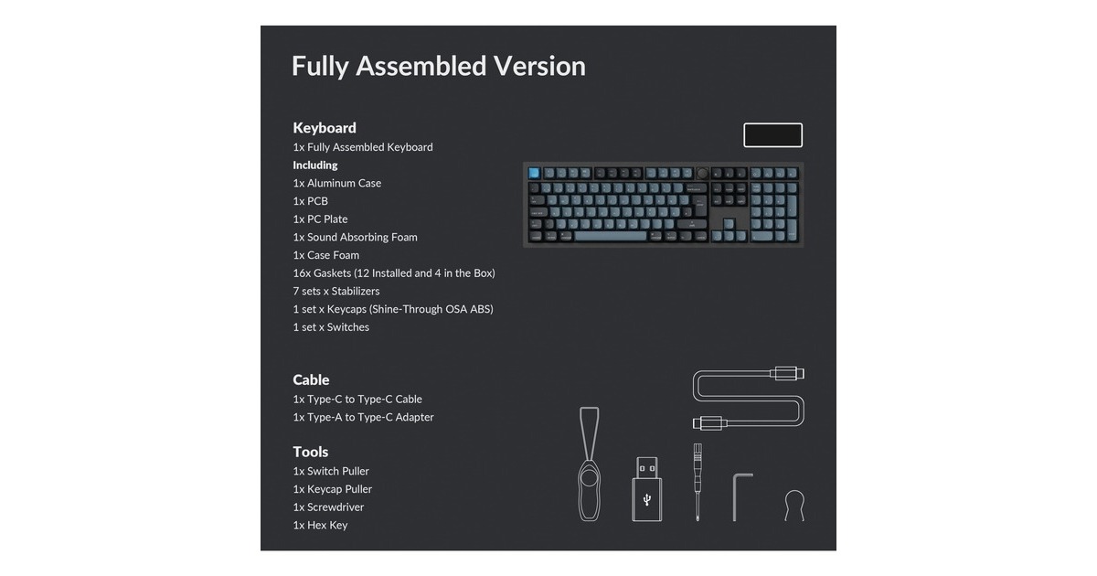 DE-ISO-Layout | Vollständig montierte Tastatur inkl. Aluminiumrahmen, PCB, PC-Platte, schalldämmender Schaumstoff, Gehäuseschaumstoff, 16 Gaskets (12 vorinstalliert, 4 zusätzlich), 7 Sets an Stabilisatoren, Drehregler, 1 Set ABS-Tastenkappen und 1 Set Keychron K Pro Tastenschalter (vorgeschmiert) | Wiederaufladbarer 4000 mAh Li-Polymer-Akku | Akkulaufzeit: Bis zu 300 Stunden bei ausgeschalteter Hintergrundbeleuchtung, bis zu 100 Stunden bei eingeschalteter Hintergrundbeleuchtung | Bluetooth-Version: 5.1 | Polling-Rate Bluetooth: 90 Hz | Polling-Rate USB-Kabel: 1.000 Hz |