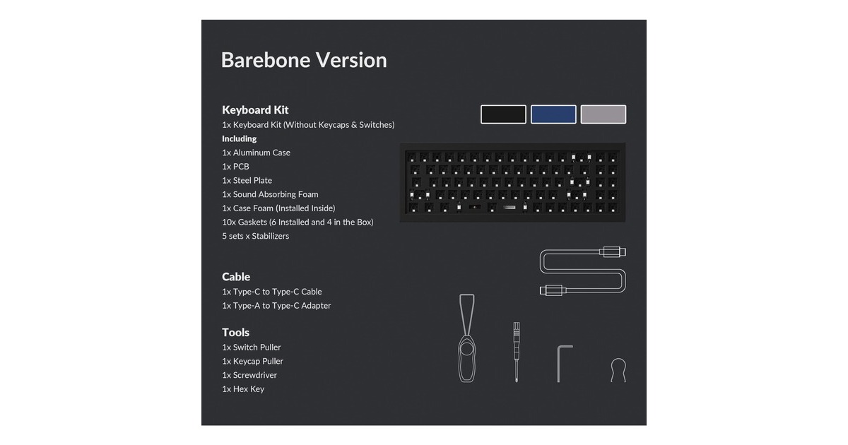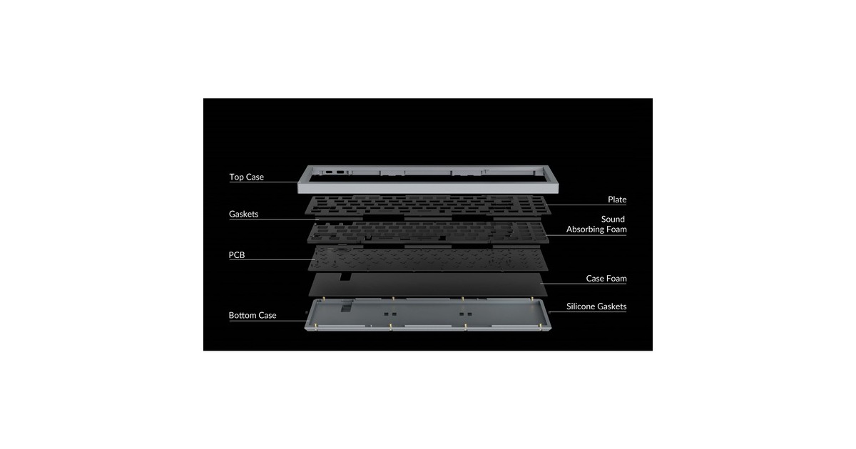 Barebone Keyboard Kit (ohne Tasten und Schalter): Aluminiumrahmen, PCB, Stahlplatte, schalldämmender Schaumstoff, Gehäuse Schaumstoff (vorinstalliert), 10 Gaskets (6 vorinstalliert, 4 zusätzlich), 5 Sets an Stabilisatoren |