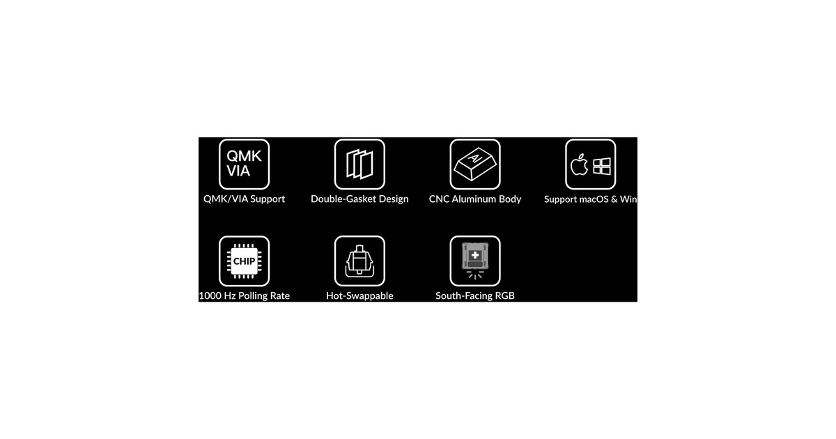 Aluminiumrahmen (6063 Aluminium, CNC-gefräst, poliert, eloxiert, sandgestrahlt) | Eingeschraubte PCB-Stabilisatoren | Vollständige QMK- und VIA-Unterstützung | macOS-Windows-Umschalter |