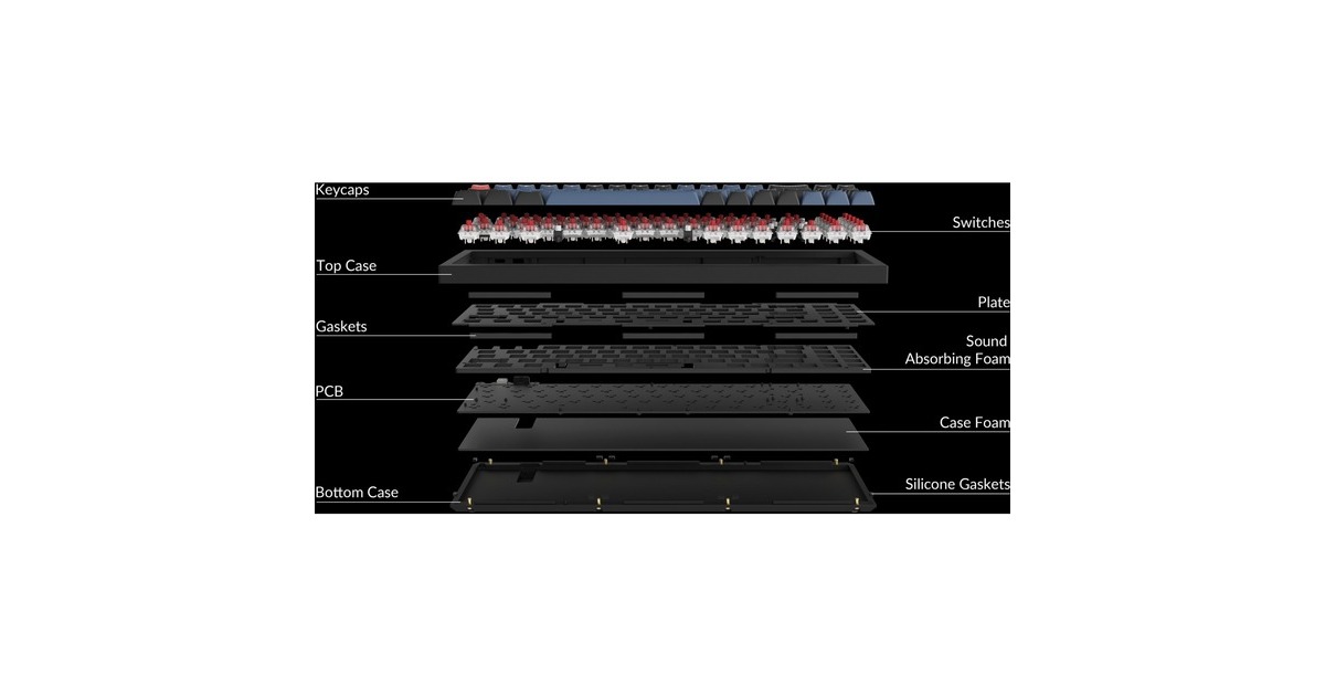 Vollständig montierte Tastatur inkl. Aluminiumrahmen, PCB, Stahlplatte, schalldämmender Schaumstoff, Gehäuse Schaumstoff (vorinstalliert), 10 Gaskets (6 vorinstalliert, 4 zusätzlich), 5 Sets an Stabilisatoren, 1 Set ABS-Tastenkappen und 1 Set Gateron G Pro Tastenschalter (vorgeölt) |