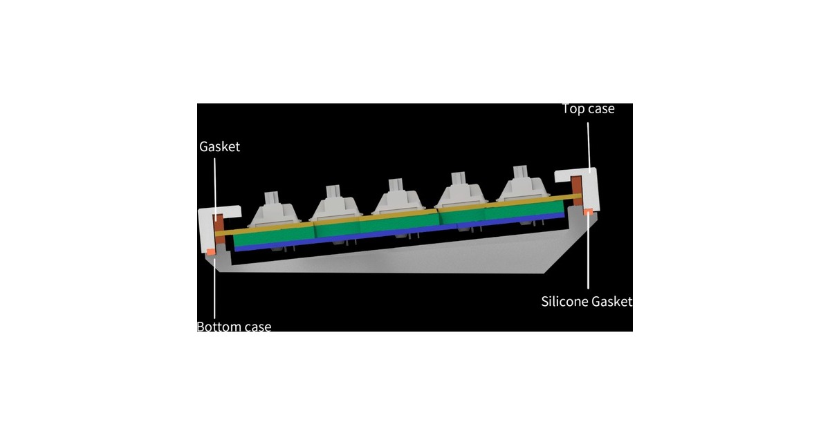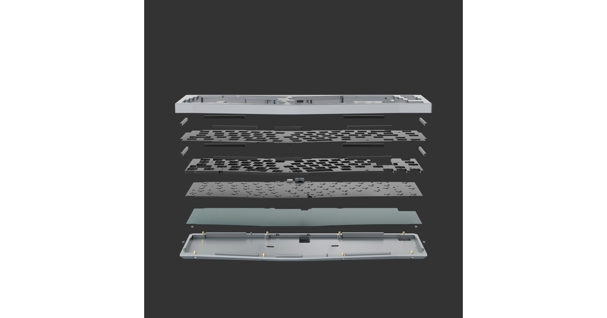 Barebone Keyboard Kit (ohne Tasten und Schalter): Aluminiumrahmen, PCB, Stahlplatte, 14 Gaskets (10 vorinstalliert, 4 zusätzlich), 5 Sets an Stabilisatoren, Schallschutzband |