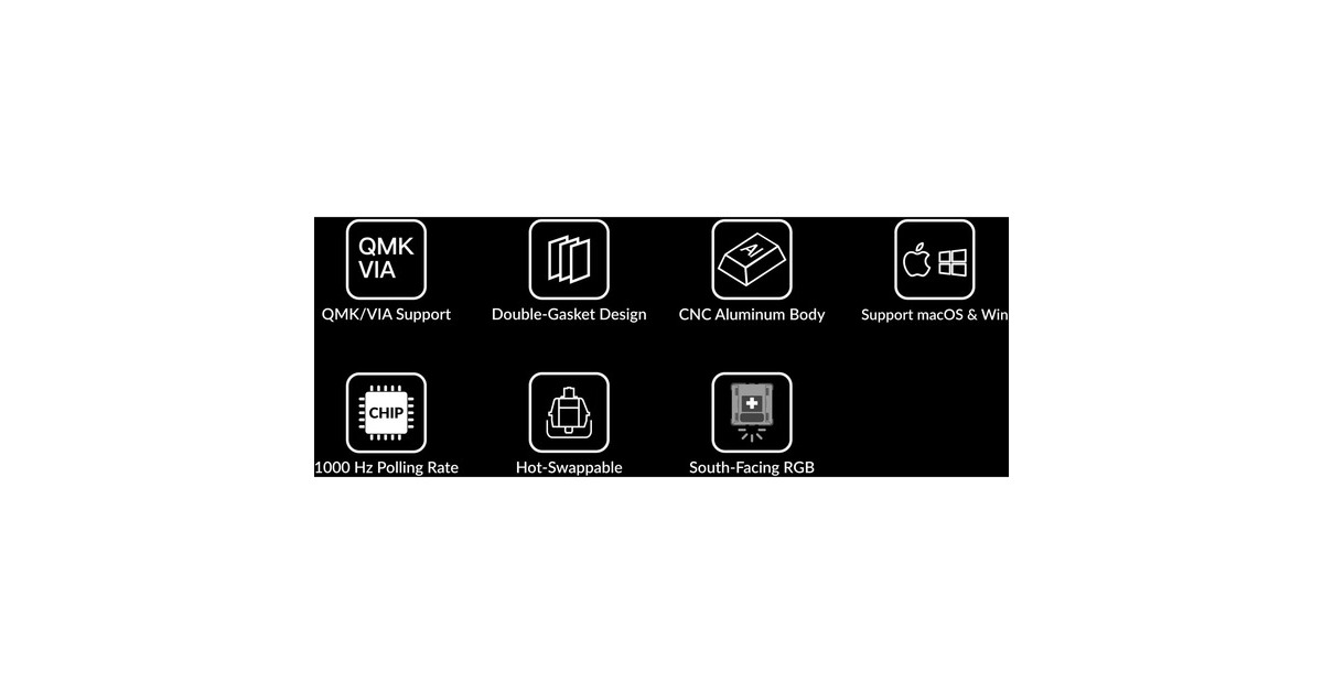 Aluminiumrahmen (6063 Aluminium, CNC-gefräst, poliert, eloxiert, sandgestrahlt) | Eingeschraubte PCB-Stabilisatoren | Vollständige QMK- und VIA-Unterstützung | macOS-Windows-Umschalter |