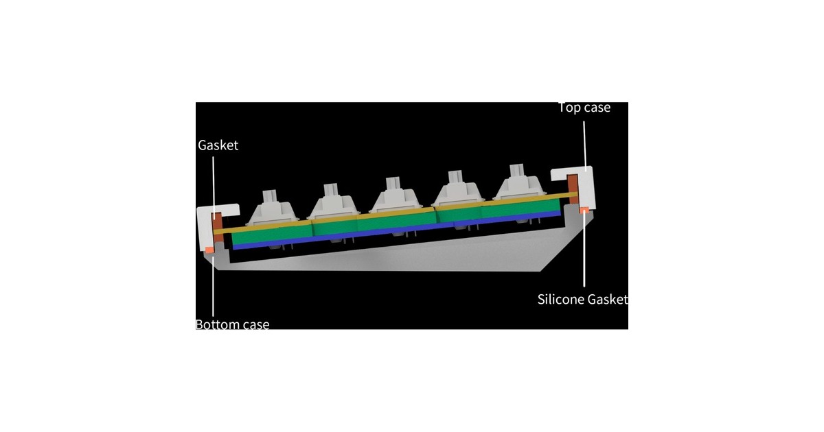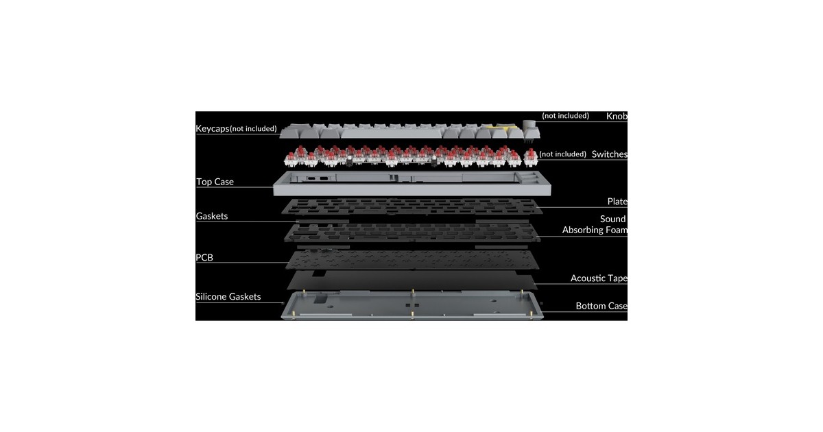 Barebone Keyboard Kit (ohne Tasten und Schalter): Aluminiumrahmen, PCB, Stahlplatte, 8 Gaskets (8 vorinstalliert), 3 Sets an Stabilisatoren, Akustikband |