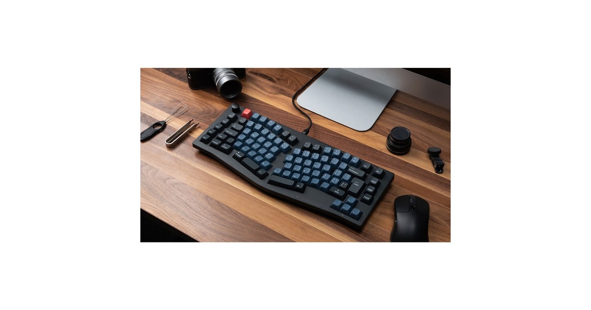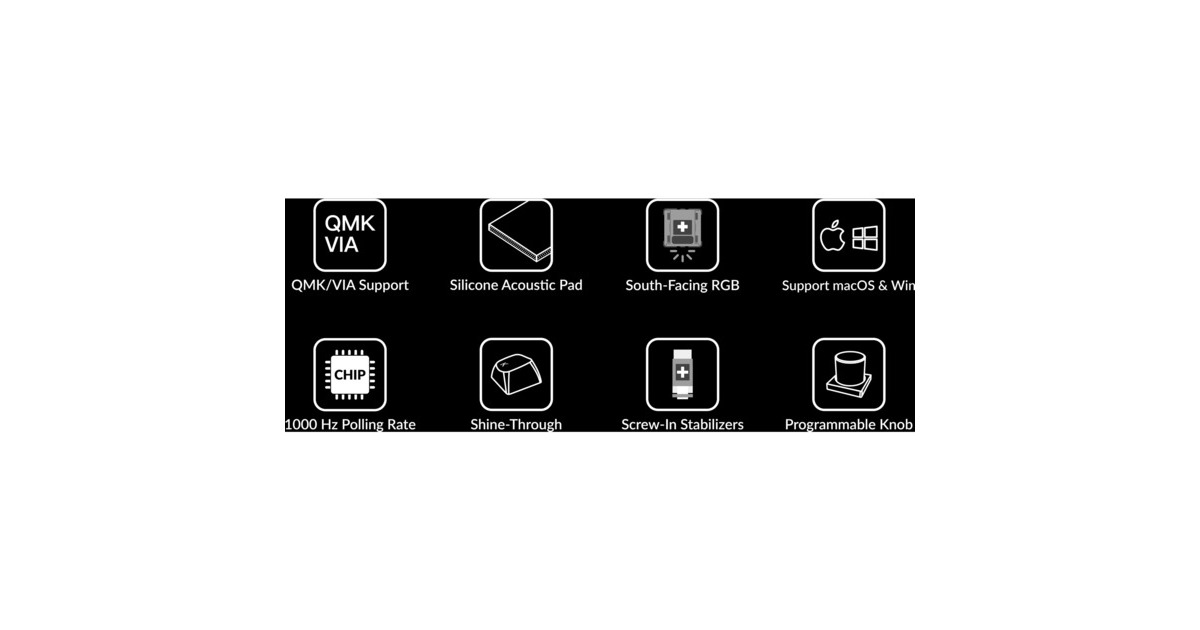 Ergonomisches Alice-Layout | ABS-Rahmen | Durchscheinende ABS-Tastenkappen mit OSA-Profil (OEM-Höhe, SA-Form) | Nach Süden ausgerichtete RGB-LEDs | Tray-Mount Design | Eingeschraubte PCB-Stabilisatoren | Vollständige QMK- und VIA-Unterstützung | macOS-Windows-Umschalter | Neigungswinkel: 3,5° / 6,7° / 9,3° |