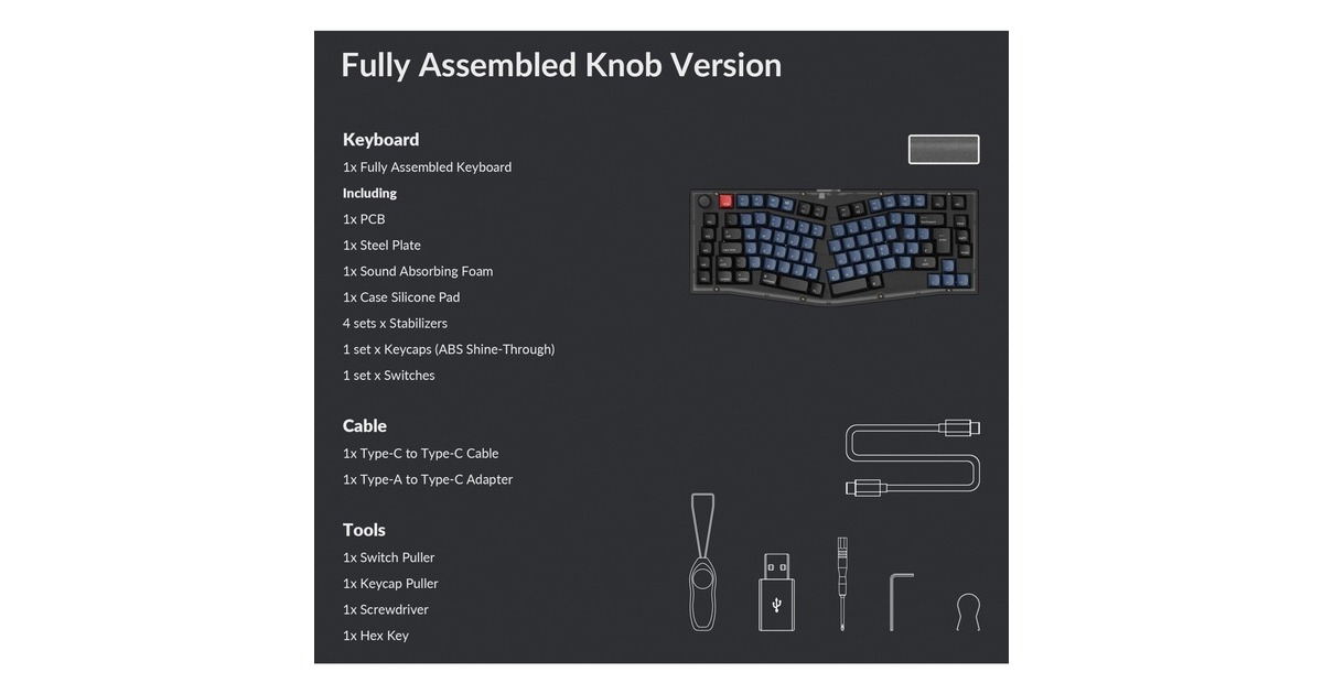 USB-C-Kabel, USB-A auf USB-C-Adapter, Tastenkappenzieher, Schalterabzieher, Schraubendreher, Innensechskantschlüssel |