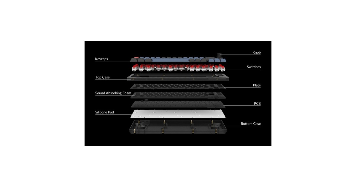 ABS-Rahmen | ABS-Tastenkappen mit OSA-Profil (OEM-Höhe, SA-Form) | Nach Süden ausgerichtete RGB-LEDs | Tray-Mount Design | Eingeschraubte PCB-Stabilisatoren | Vollständige QMK- und VIA-Unterstützung | macOS-Windows-Umschalter |