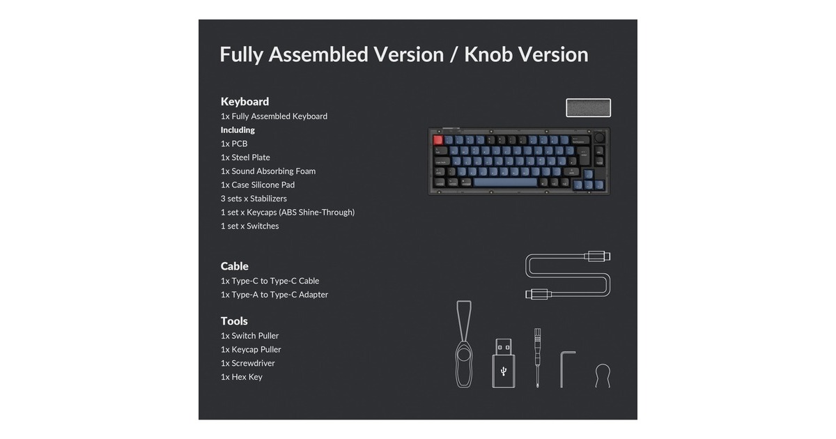 USB-C-Kabel, USB-A auf USB-C-Adapter, Tastenkappenzieher, Schalterabzieher, Schraubendreher, Innensechskantschlüssel |