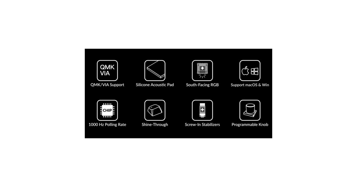 ABS-Rahmen | ABS-Tastenkappen mit OSA-Profil (OEM-Höhe, SA-Form) | Nach Süden ausgerichtete RGB-LEDs | Tray-Mount Design | Eingeschraubte PCB-Stabilisatoren | Vollständige QMK- und VIA-Unterstützung | macOS-Windows-Umschalter |