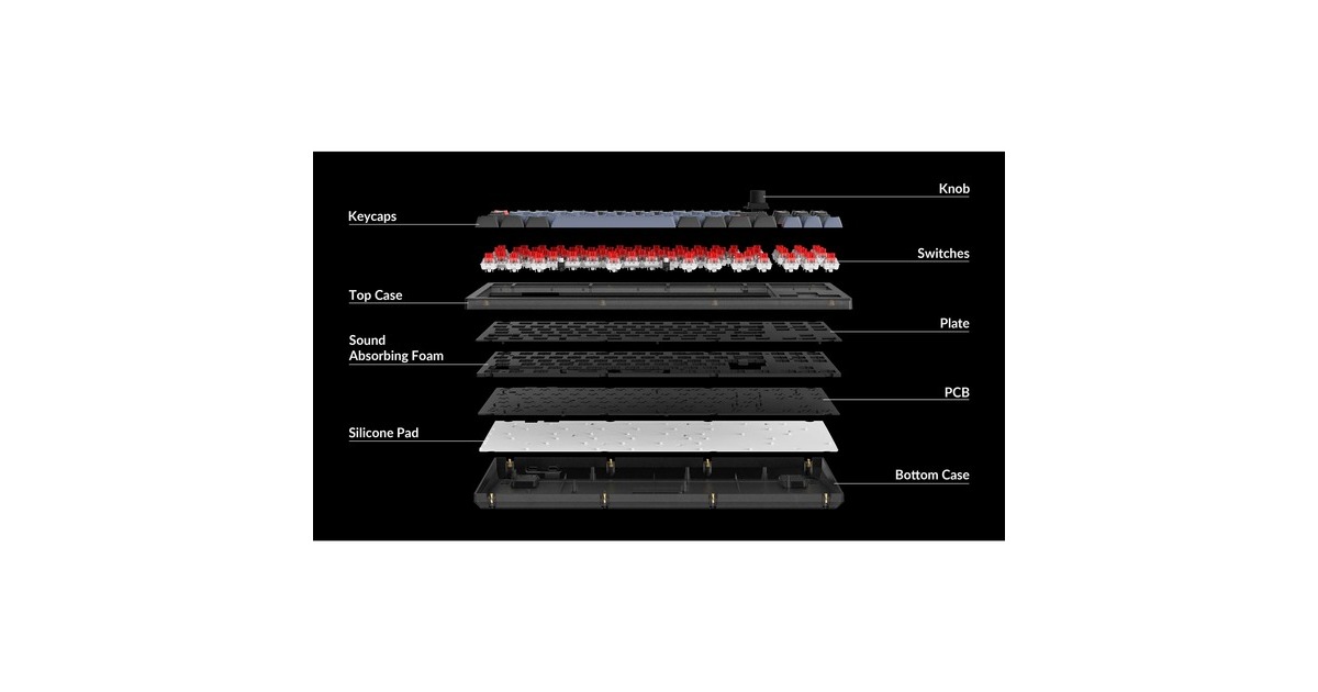 ABS-Rahmen | ABS-Tastenkappen mit OSA-Profil (OEM-Höhe, SA-Form) | Programmierbarer Drehregler | Nach Süden ausgerichtete RGB-LEDs | Eingeschraubte PCB-Stabilisatoren | Vollständige QMK- und VIA-Unterstützung | macOS-Windows-Umschalter |