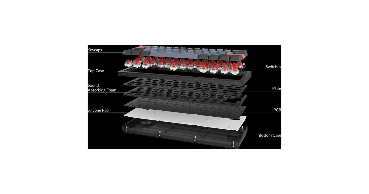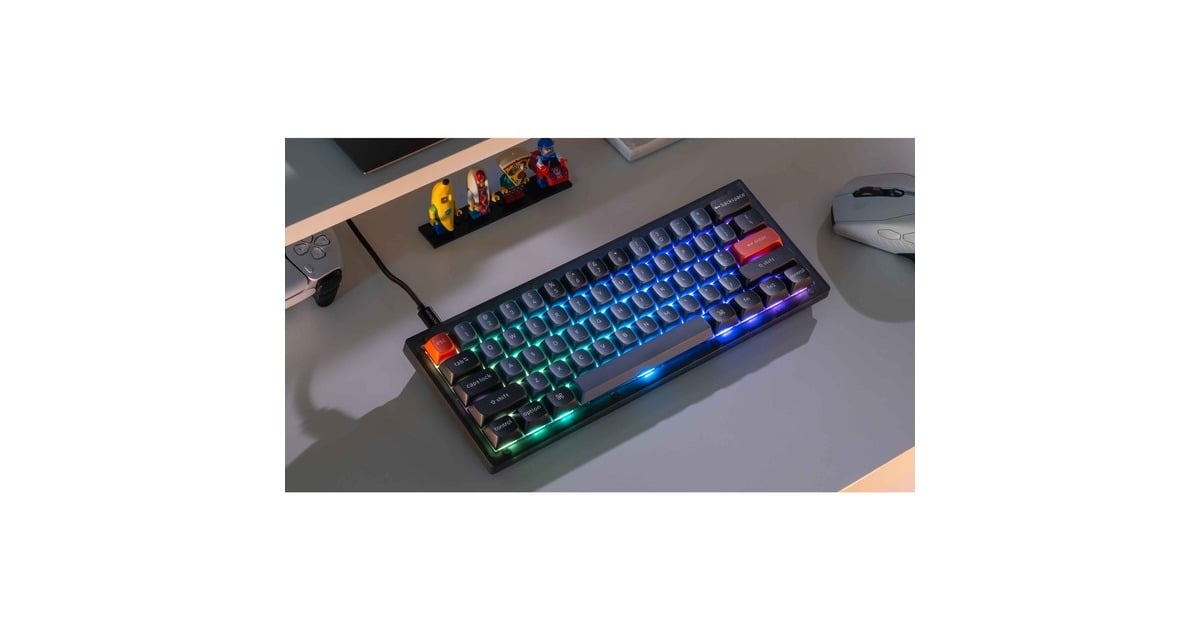 ABS-Rahmen | ABS-Tastenkappen mit OSA-Profil (OEM-Höhe, SA-Form) | Nach Süden ausgerichtete RGB-LEDs | Tray-Mount Design | Eingeschraubte PCB-Stabilisatoren | Vollständige QMK- und VIA-Unterstützung | macOS-Windows-Umschalter |