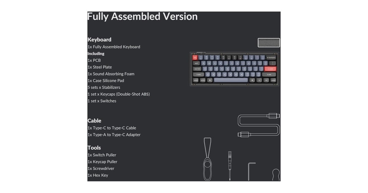 USB-C-Kabel, USB-A auf USB-C-Adapter, Tastenkappenzieher, Schalterabzieher, Schraubendreher, Innensechskantschlüssel |