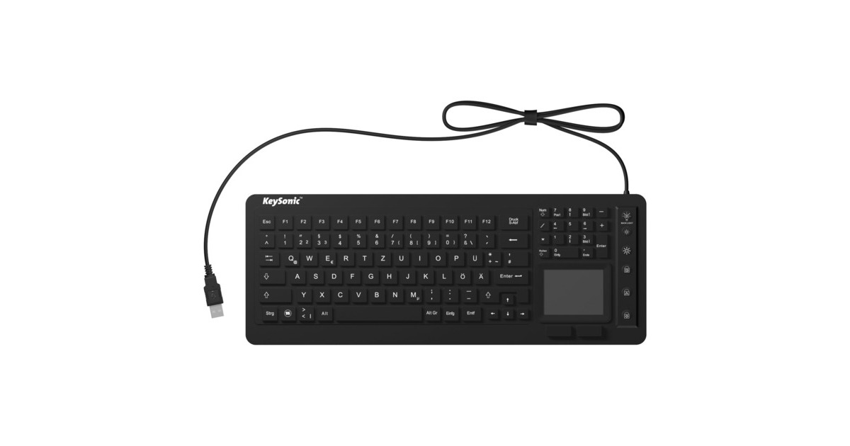 Die KeySonic KSK-6231 IN ist eine ergonomisch gestaltete Silikonummantelte-Tastatur mit 98 Tasten, Hintergrundbeleuchtung und Multi-Finger Touchpad. Die Keysonic Tastatur verfügt über ein ausgezeichnetes, taktiles Druckgefühl und ist wasserdicht nach IP68 und kann somit sogar in Flüssigkeiten eingetaucht werden. Die Oberfläche der Keysonic Tastatur ist mit einer speziellen Oberflächenversiegelung ausgestattet und weist daher eine gute mechanische und chemische Beständigkeit auf, so dass mit Standard Desinfektionsmitteln gearbeitet werden kann, ohne dass die Tasten ihre Beschriftung verlieren. Das integrierte Touchpad ermöglicht den Einsatz der Keysonic Tastatur ohne externe, zusätzliche Maus. Dies ist sowohl ein Kosten- als auch ein praktischer Vorteil, denn das Touchpad lässt sich sowohl mit als auch ohne Gummihandschuhe einwandfrei bedienen.Art.-Nr.: 1126227
