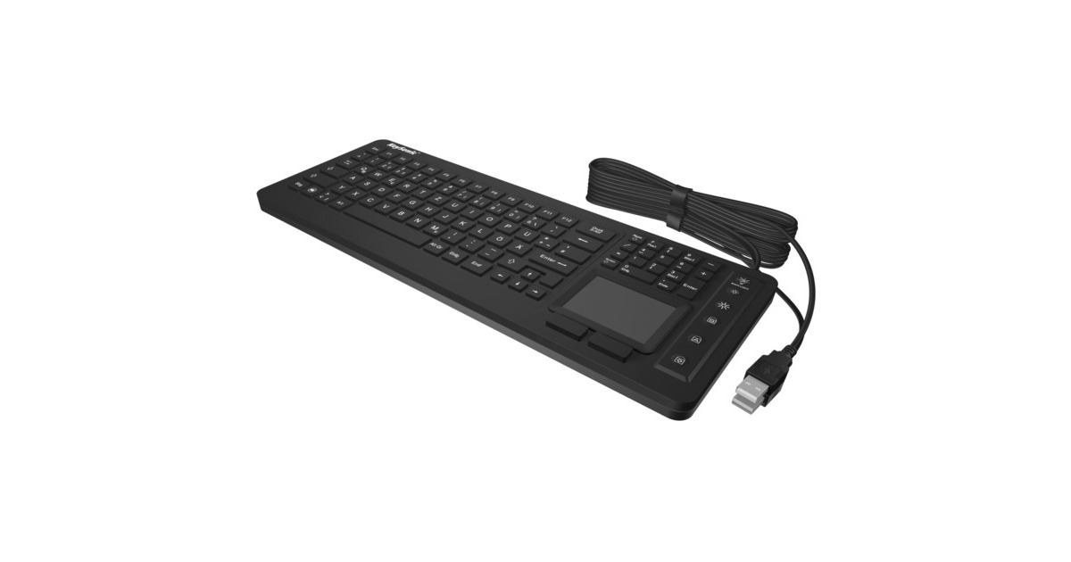 Integriertes und versiegeltes Multifinger Touchpad mit Mausfunktionen, 100% wasserdicht, spritzwassergeschützt, spülmaschinenbeständig, antimikrobischer Silikonschutz, UV-resistenter Tastenaufdruck - kein Verblassen, Hintergrundbeleuchtung: An-/Ausschaltbar, zwei Helligkeiten wählbar, blau |