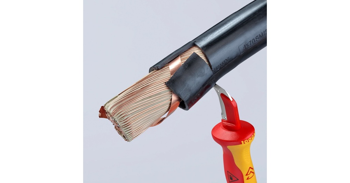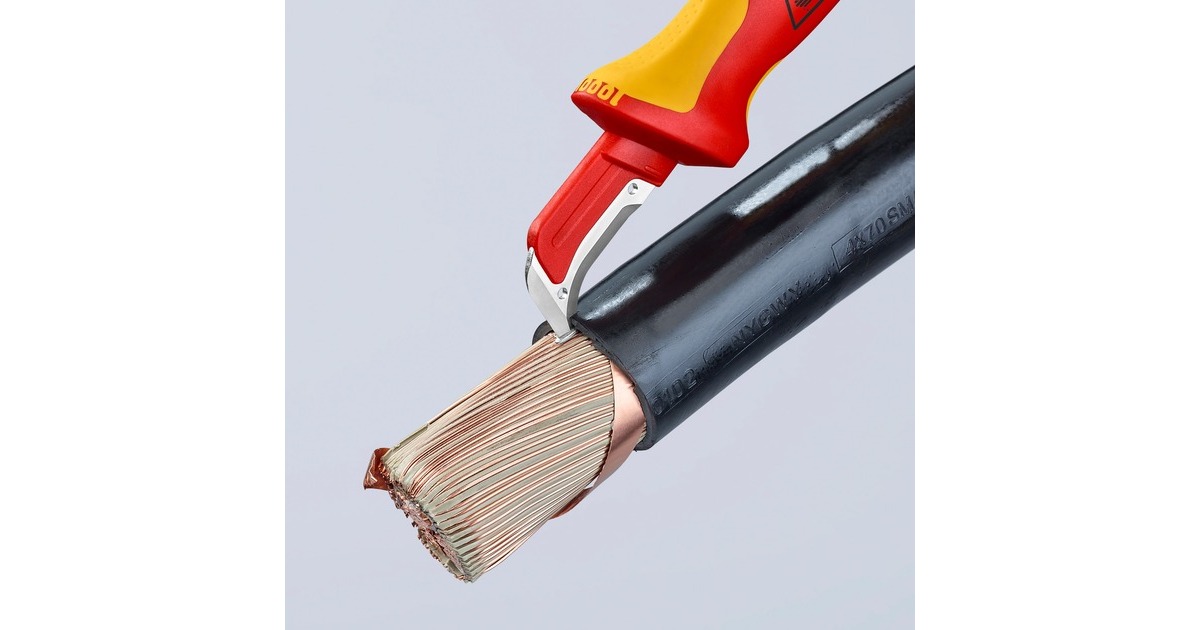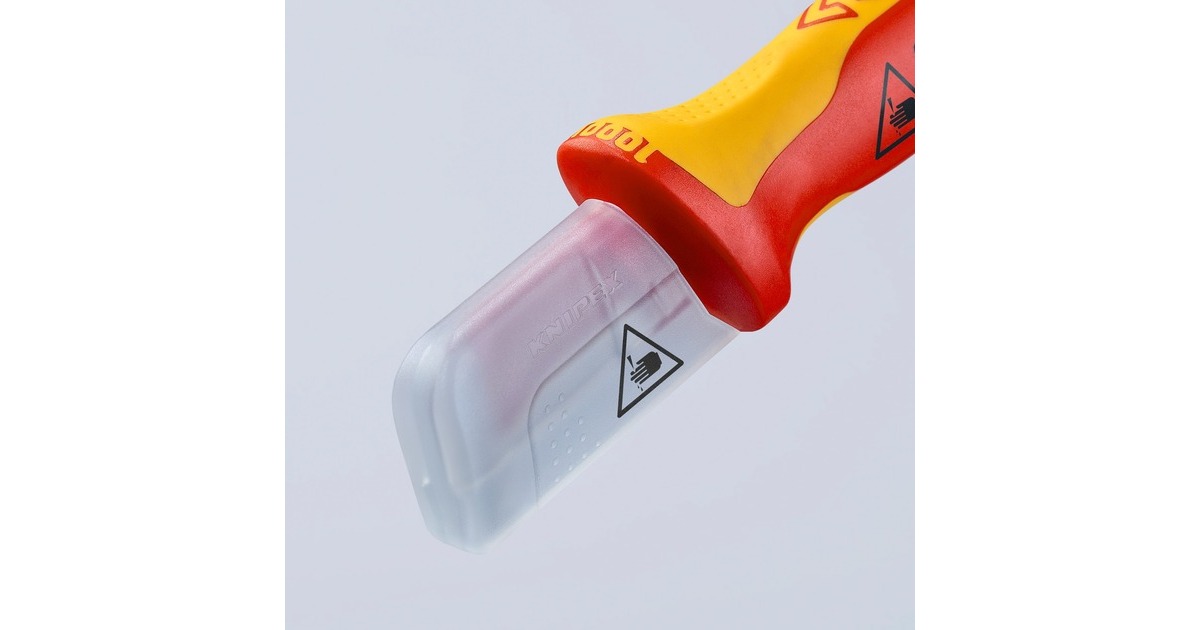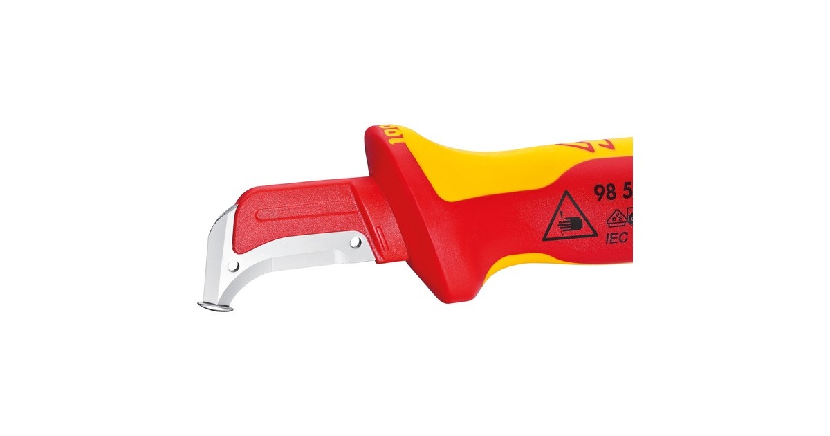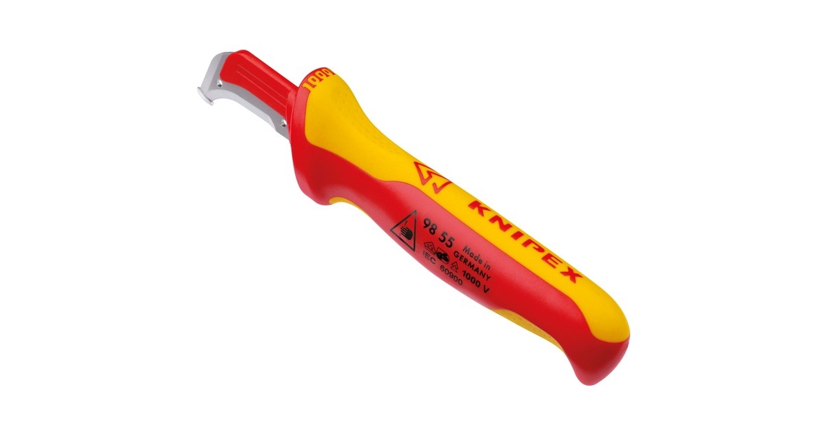 Das 180mm lange Knipex Abmantelungsmesser 98 55 SB besticht durch seine verbesserte Ergonomie. Der Griff verfügt über einen angenehm gestalteten Abgleitschutz und besteht aus rutschfester Weichkomponente. Die Daumenmulde und der Fingerhaken am Griffende sorgen für eine gute Kraftübertragung beim ziehen des Messers. Eine transparente Schutzkappe schützt sowohl Messer als auch Anwender bei der Verstauung. Zusätzlich ist der Griff VDE-geprüft und beständig bis 1000V. Dieses Modell verfügt über eine sichelförmige, feststehende Hakenklinge mit Gleitschuh an der Spitze. Die Klinge besteht aus rostfreiem, luftgehärtetem Chirurgiestahl.Art.-Nr.: 1265573