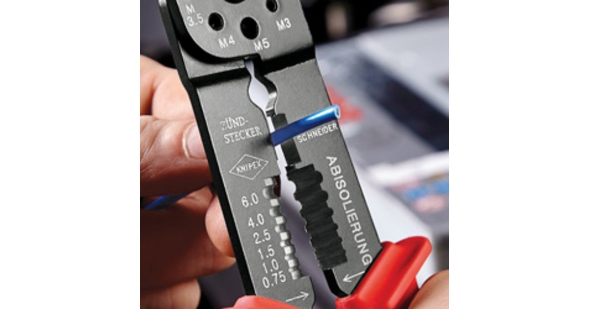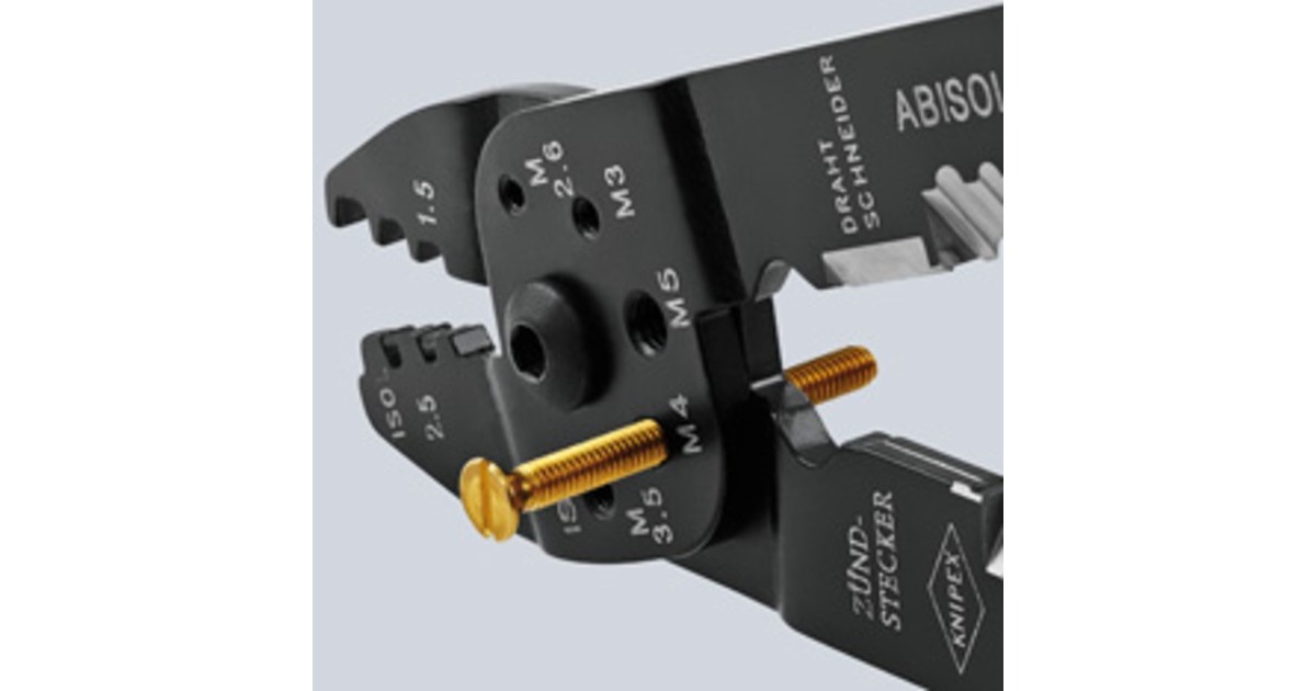 Die Knipex Crimpzange 97 21 215 B eignet sich zum Kabelschneiden, Abisolieren von Drähten und Crimpen von isolierten und unisolierten Kabelschuhen und Steckverbindern und offenen Steckverbindern. Sie verfügt außerdem über Gewindelöcher zum Abschneiden von Cu- oder Ms-Gewindestiften mit M2,6 - M3 - M3,5 - M4 - M5. Das geschraubte Gelenk sorgt für eine hohe Stabilität und gleichmäßigen Lauf. Die Crimpzange 97 21 215 B ist aus hochfestem Spezialstahl gefertigt.Art.-Nr.: 1265816