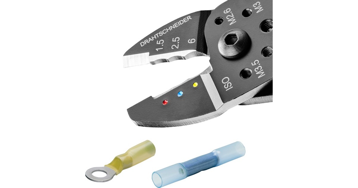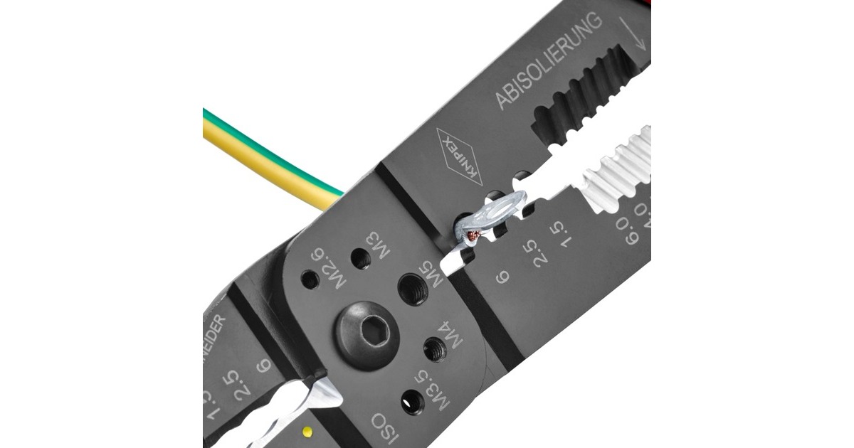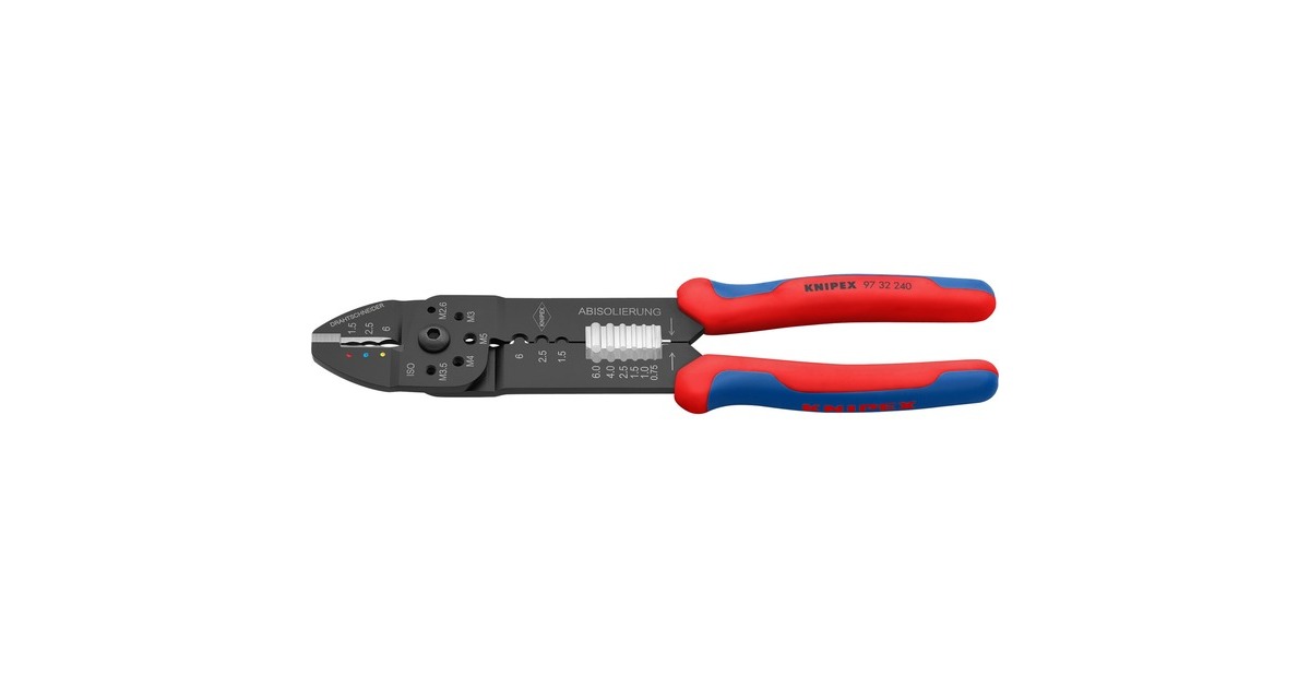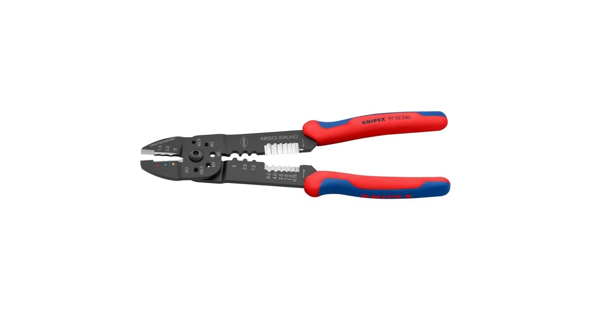 Die Knipex Crimpzange 97 32 240 eignet sich zum Kabelschneiden, zum Abisolieren von Drähten und zum Crimpen von isolierten Kabelschuhen und isolierten Schrumpfschlauchverbindern sowie unisolierten Quetschkabelschuhen nach DIN 46234. Sie verfügt außerdem über Gewindelöcher zum Abschneiden von Cu- oder Ms-Gewindestiften mit M2,6 - M3 - M3,5 - M4 - M5. Das geschraubte Gelenk sorgt für eine hohe Stabilität und gleichmäßigen Lauf. Die Crimpzange 97 32 240 ist aus hochfestem Spezialstahl gefertigt und schwarz lackiert, die Griffe sind dank Mehrkomponenten-Hüllen besonders rutschsicher und komfortabel.Art.-Nr.: 1867003
