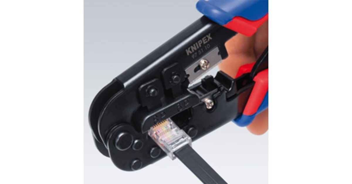 Die Knipex Crimpzange 97 51 10 ist ein Profiwerkzeug zum Schneiden und Abmanteln von flachem, nicht abgeschirmtem Telefonkabel und zum Verpressen von 6- und 8-poligen Westernsteckern Typ RJ-11/12 (9,65mm breit) und Typ RJ-45 (11,68mm breit). Die Parallelcrimpung gewährleistet dabei einen exakten Crimpvorgang, und die Zwangssperre (entriegelbar) sorgt für eine gleichbleibend hohe Crimpqualität. Ein Längenabschneider und Abmantelungsmesser für Flachkabel 6mm und 12mm Länge mit zusätzlicher Abisolier-Funktion für Rundkabel ist ebenfalls integriert. Die Crimpzange 97 51 10 ist aus Chrom-Vanadium-Elektrostahl in Sondergüte gefertigt und ölgehärtet.Art.-Nr.: 1265836
