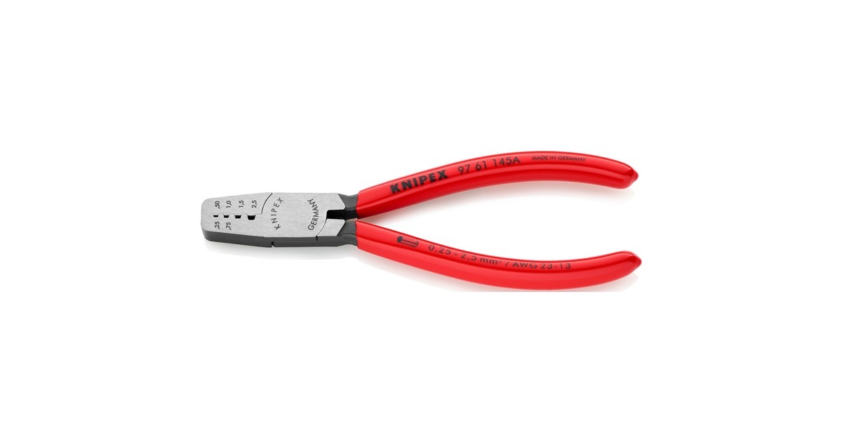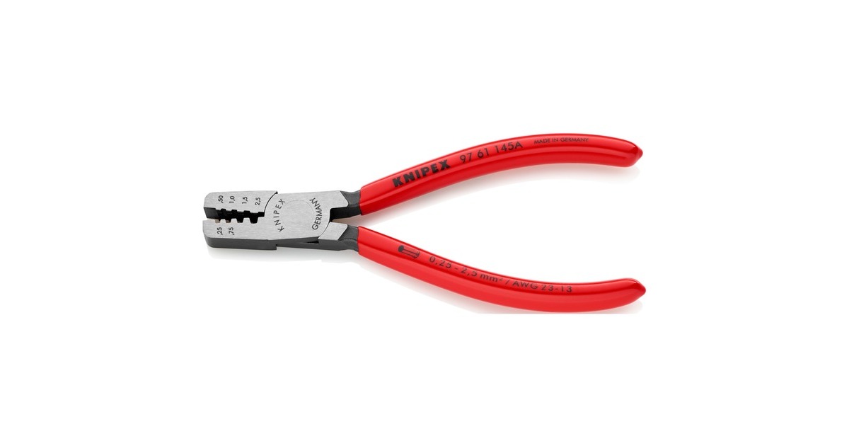 Die Knipex Crimpzange 97 61 145 A eignet sich zum Verpressen von Aderendhülsen DIN 46228 Teil 1 + 4 im Bereich von 0,25mm² bis 2,5mm². Die Verpressung erfolgt in gekennzeichneten Trapezprofilen für die sichere Verbindung von Hülse und Leiter. Die Crimpzange 97 61 145 A ist aus Vanadium-Elektrostahl geschmiedet und ölgehärtet.Art.-Nr.: 1265845