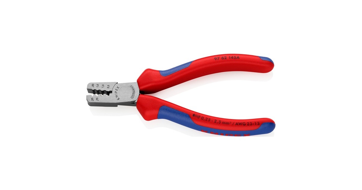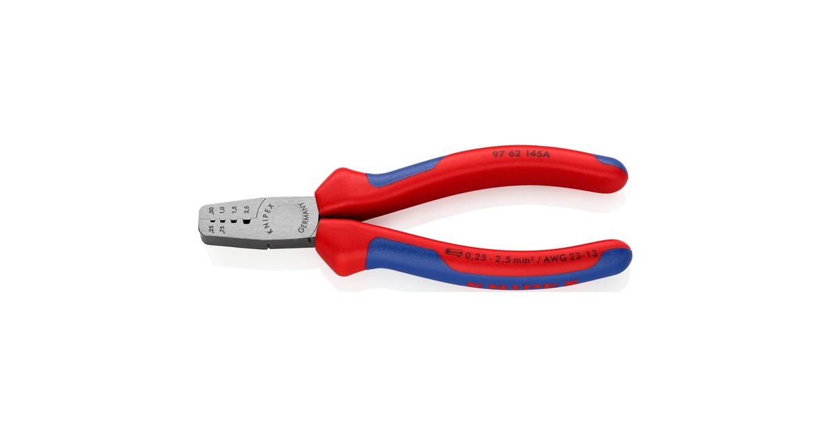 Die Knipex Crimpzange 97 62 145 A eignet sich zum Verpressen von Aderendhülsen DIN 46228 Teil 1 + 4 im Bereich von 0,25mm² bis 2,5mm². Die Verpressung erfolgt in gekennzeichneten Trapezprofilen für die sichere Verbindung von Hülse und Leiter. Die Crimpzange 97 62 145 A ist aus Vanadium-Elektrostahl geschmiedet, ölgehärtet und mit einem Mehrkomponenten-Kunststoff-Griff versehen.Art.-Nr.: 1265846