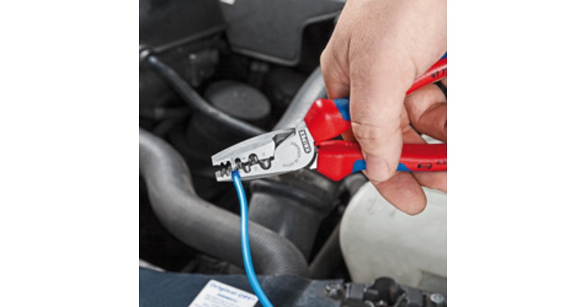 Die Knipex Crimpzange 97 72 180 eignet sich zum Verpressen von Aderendhülsen DIN 46228 Teil 1 + 4 im Bereich von 0,25mm² bis 16mm². Die Verpressung erfolgt in neun gekennzeichneten besonders tiefen Halbrundprofilen mit konischen Seitenflächen für die sichere Verbindung von Hülse und Leiter. Die Crimpzange 97 72 180 ist aus Spezial-Werkzeugstahl, geschmiedet und ölgehärtet.Art.-Nr.: 1265565