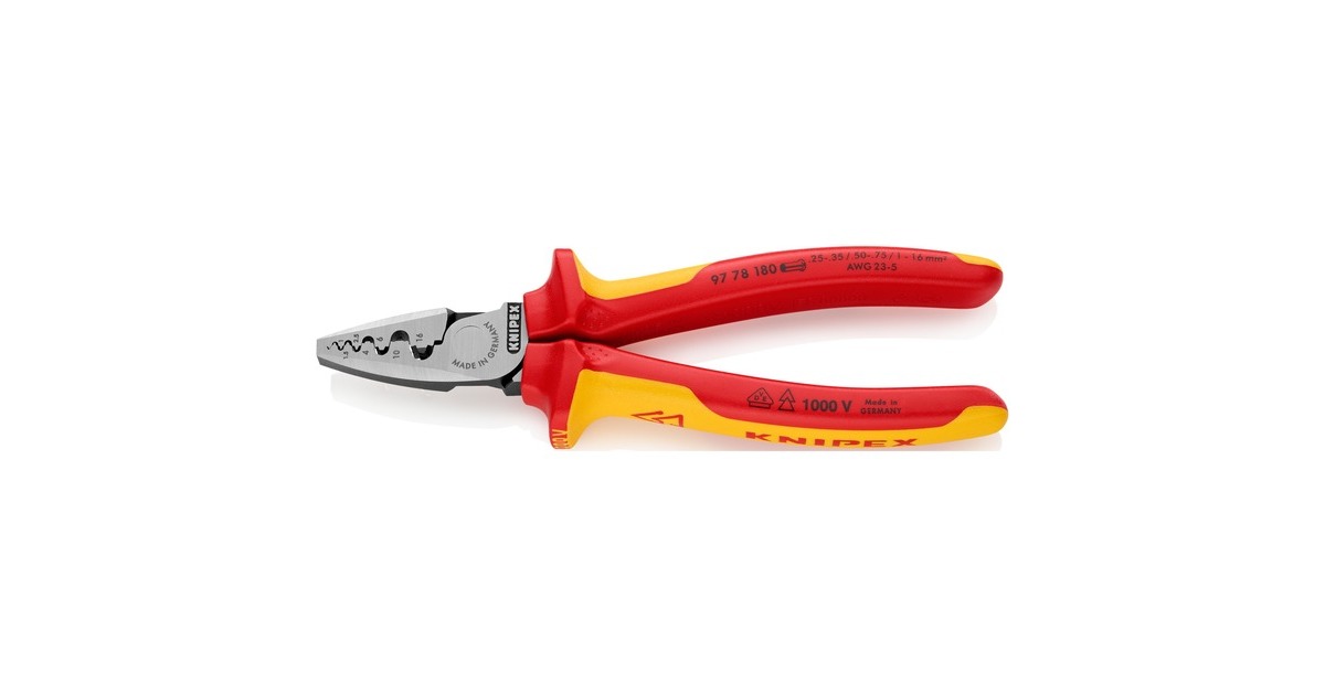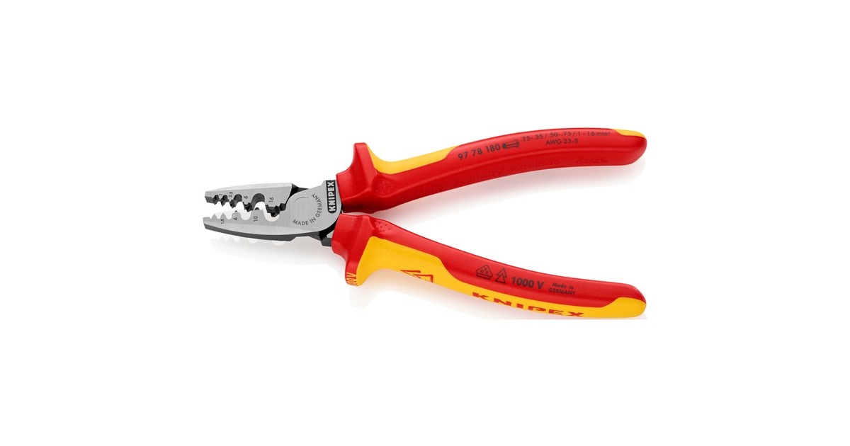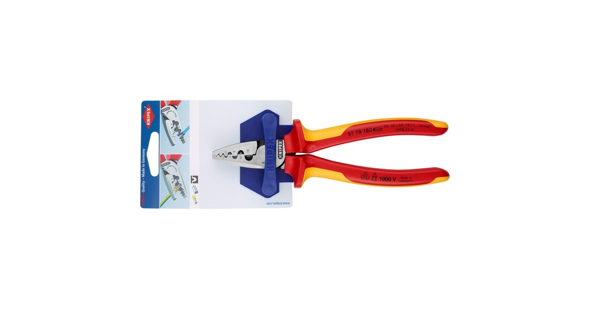 Die Knipex Crimpzange 97 78 180 eignet sich zum Verpressen von Aderendhülsen DIN 46228 Teil 1 + 4 im Bereich von 0,25mm² bis 16mm². Die Verpressung erfolgt in neun gekennzeichneten besonders tiefen Halbrundprofilen mit konischen Seitenflächen für die sichere Verbindung von Hülse und Leiter. Die Crimpzange 97 78 180 ist aus Spezial-Werkzeugstahl, geschmiedet, ölgehärtet und mit einem isolierten Mehrkomponenten-Kunststoff-Griff nach VDE versehen.Art.-Nr.: 1265566