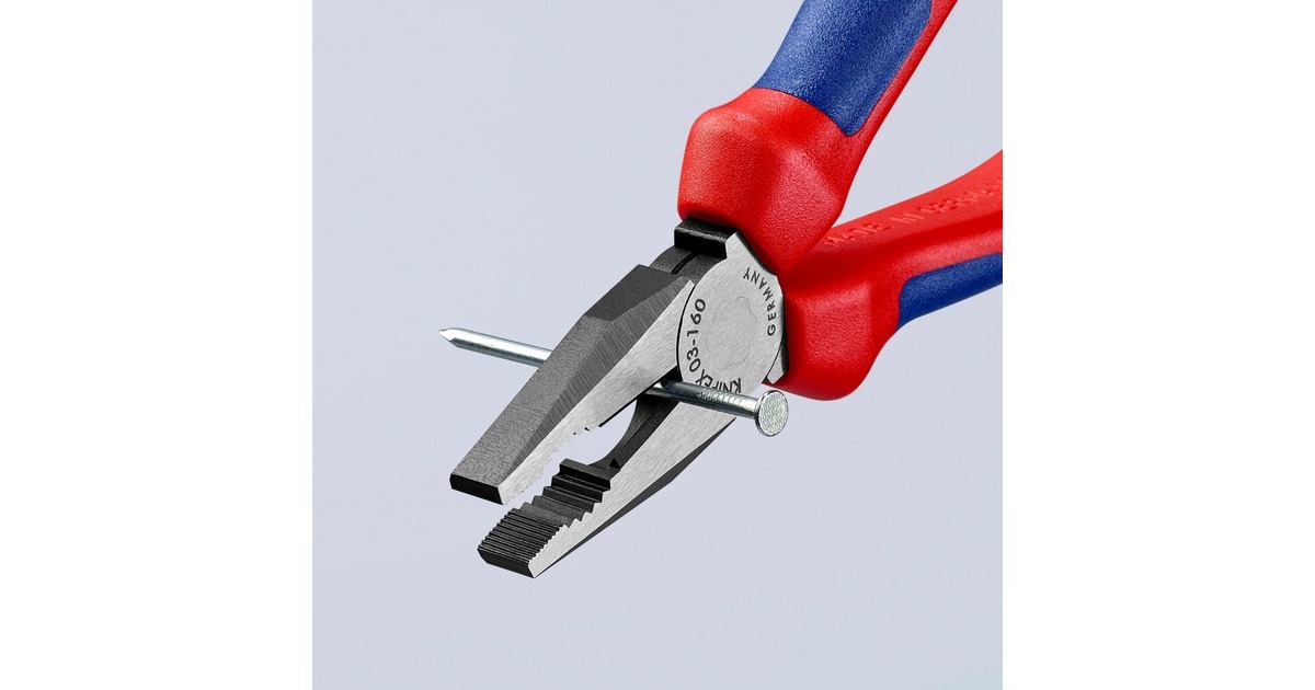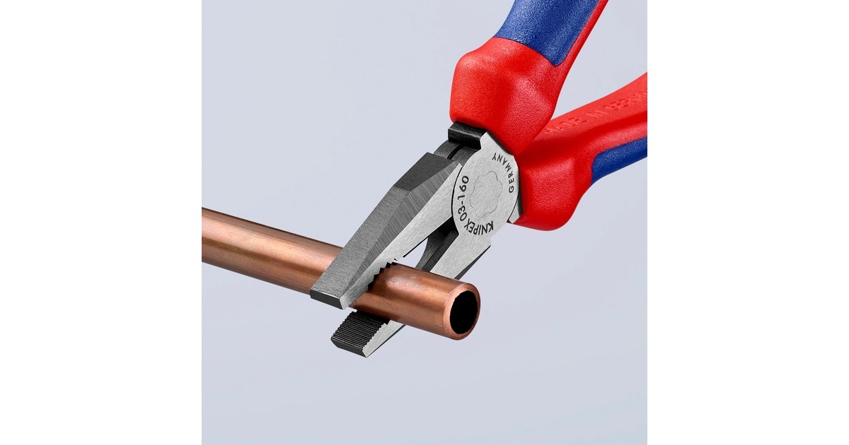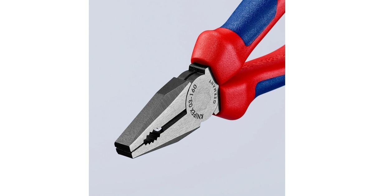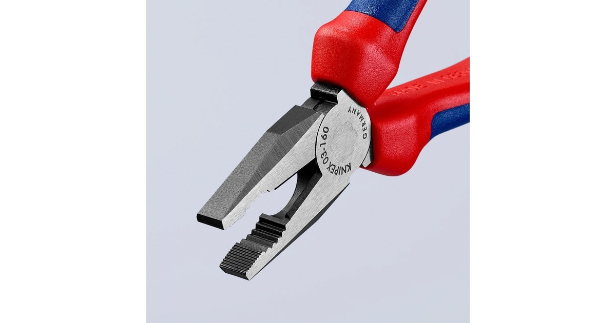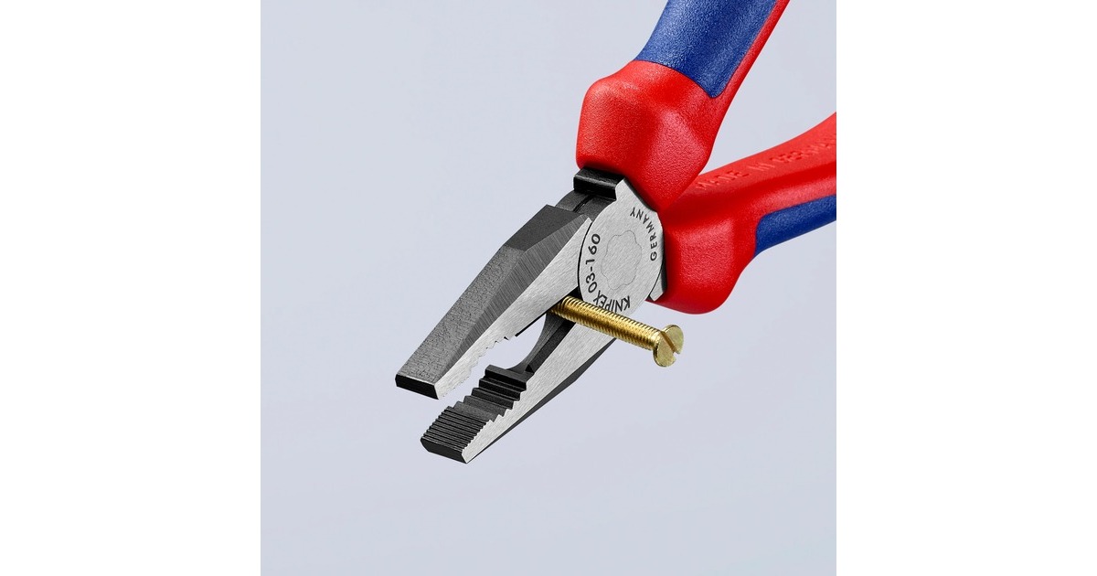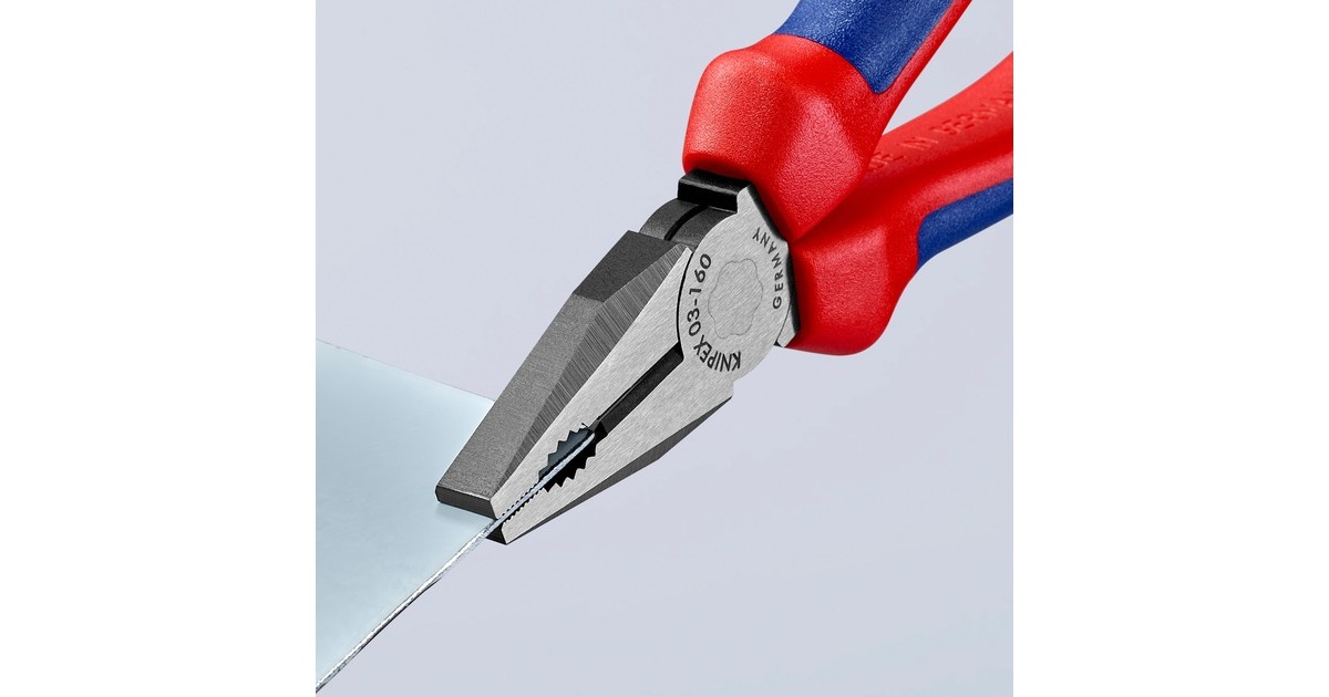 Die Knipex Kombizangen 03 02 160 aus Spezial-Werkzeugstahl sind geschmiedet und ölgehärtet. Ihre Greifzonen sind für vielseitigen Einsatz konzipiert und die langen Schneiden haben auch mit dickeren Kabeln keine Probleme. Die Schneiden sind zusätzlich induktiv gehärtet mit einem Härtegrad von ca. 60 HRC. Mehrdrähtige Cu-Kabel sind für die Zange bis 16mm² ein Kinderspiel.Art.-Nr.: 1265015