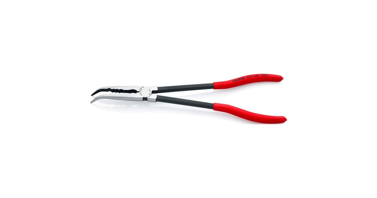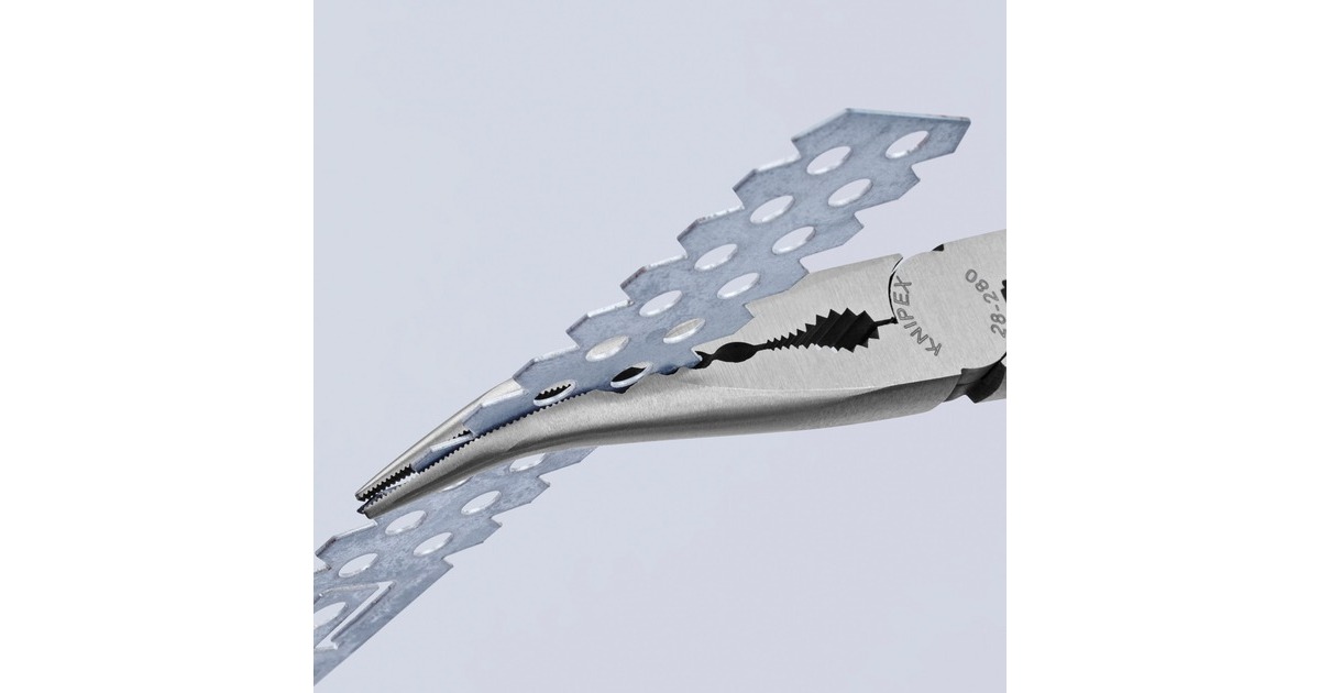 Die um 45° abgewinkelte Montierzange 2881280 von KNIPEX eignet sich besonders für Greif-, Justier- und Montagearbeiten an schwer zugänglichen Stellen dank ihrer schlanken, sehr langen Bauform. Auch tiefliegende Werkstücke werden mit den schlanken, flach-runden Greifspitzen optimal erreicht. Sie ermöglicht schonendes und trotzdem sicheres Greifen, Halten und Führen kleiner Kupferrohre, Schrauben und Kabel sowie anderer Rundteile durch die gefrästen Nuten mit glatter Oberfläche. Sie verfügt außerdem über ein verzahntes Brennerloch zum Greifen von Rundteilen. Die gebogene Montierzange 2881280 ist besonders für Arbeiten im Kfz-Gewerbe (z.B. im Motorraum), in der Montage und im Maschinenbau geeignet. Das schlankes und trotzdem robuste Werkzeug ist aus Spezial-Werkzeugstahl geschmiedet und in Öl gehärtet.Art.-Nr.: 1331977