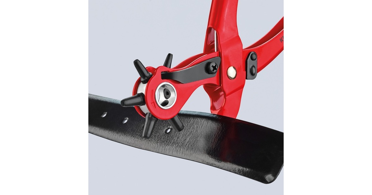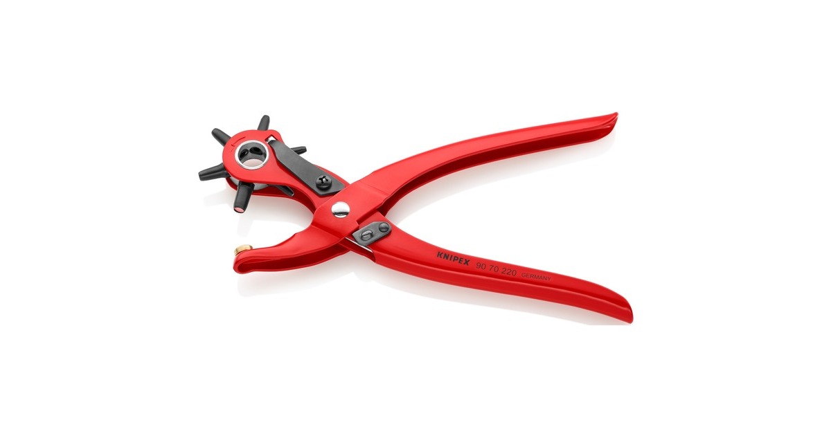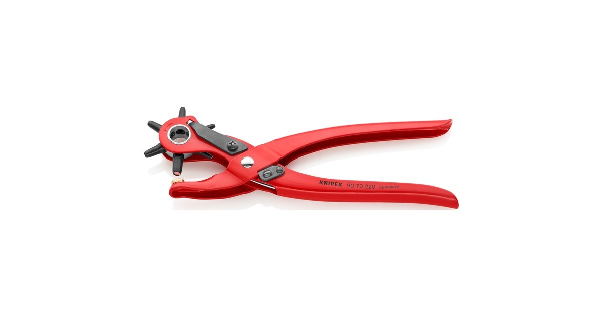 Die Knipex Revolverlochzange 90 70 220 wird zum Stanzen von Löchern in Leder, Textil- und Kunststoffmaterial verwendet. Dabei verfügt sie über 6 auswechselbare Lochpfeifen (Ø 2,0/2,5/3,0/3,5/4,0/5,0 mm). Ausgestattet mit Öffnungsfeder und Sperrklinke ist die Revolverlochzange 90 70 220 der ideale Begleiter. Sie ist pulverbeschichtet für guten Rostschutz und hohe Lebensdauer. Zangenkörper und Lochpfeifen sind aus Spezial-Werkzeugstahl und ölgehärtet.Art.-Nr.: 1265747
