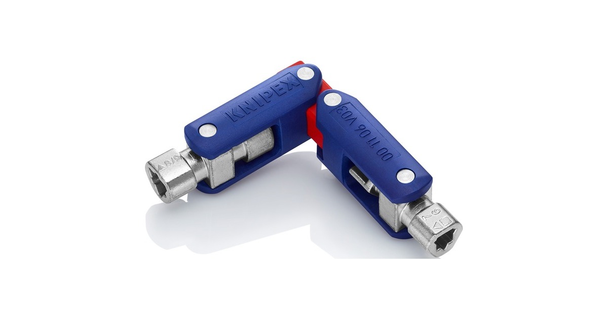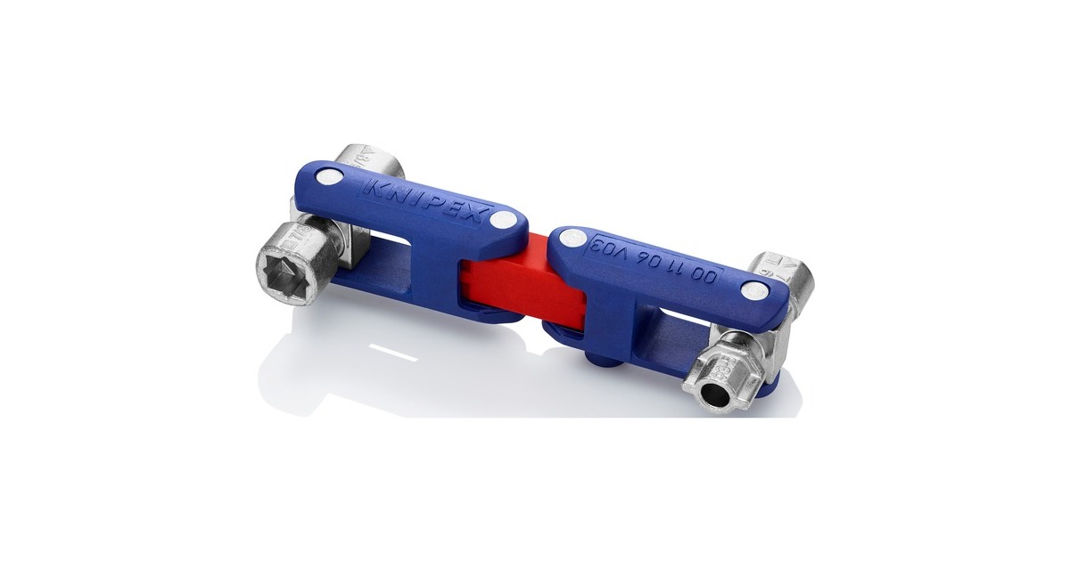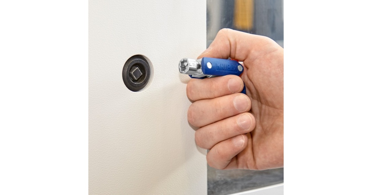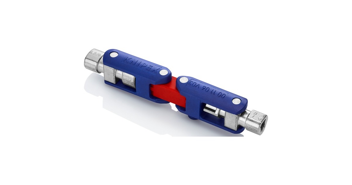 Der Schaltschrankschlüssel "DoubleJoint" von Knipex passt für verschiedene Schließsysteme in der Elektrotechnik, der Gas- und Wasserversorgung, der Klima- und Belüftungstechnik, der Industrie, Gebäudetechnik und anderen. Er bietet vier verschiedene Schließungen aus Zink-Druckguss in einem Schlüssel, zusätzlich eine Bitaufnahme für 1/4"-Bits mit Magnet-Aufnahme.