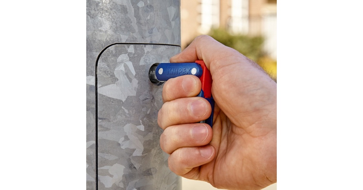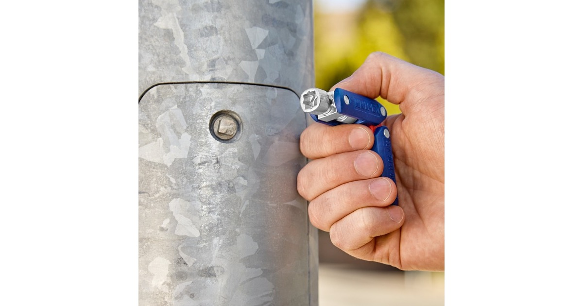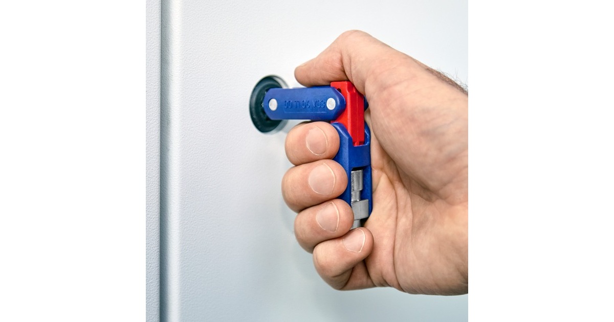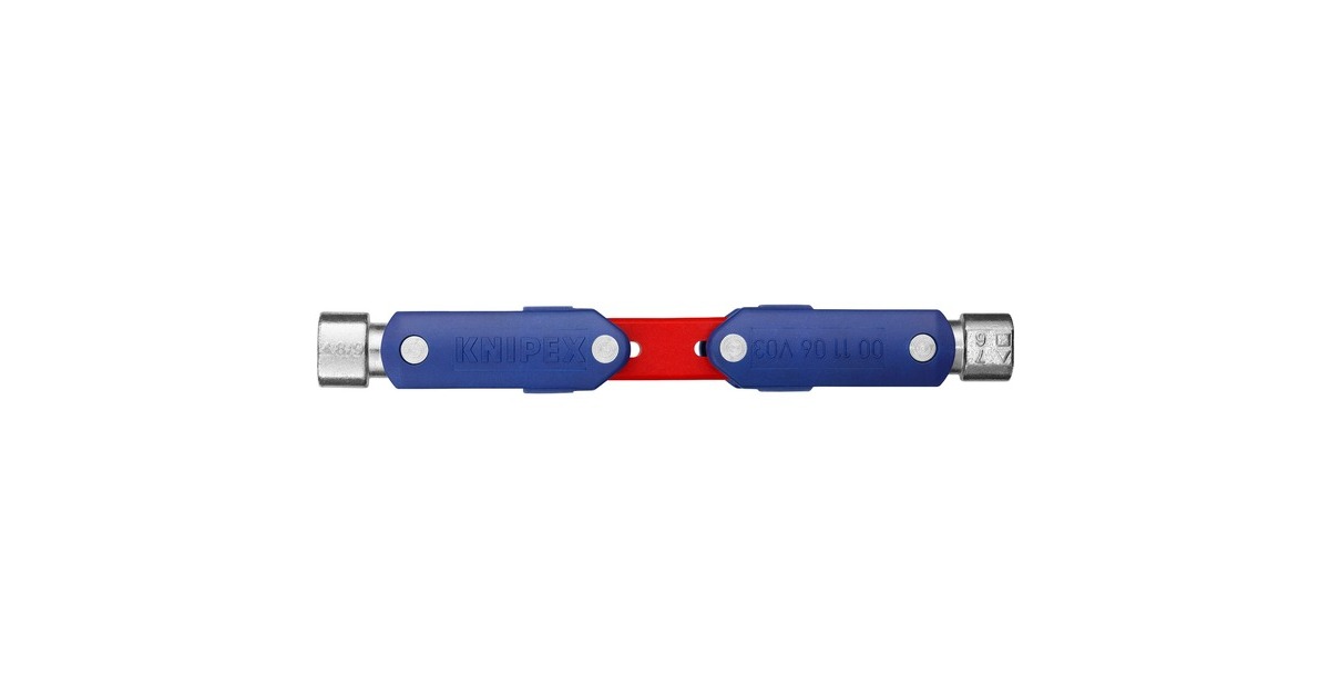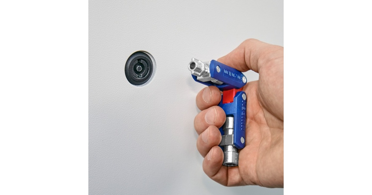 Der Schaltschrankschlüssel "DoubleJoint" von Knipex passt für verschiedene Schließsysteme in der Elektrotechnik, der Gas- und Wasserversorgung, der Klima- und Belüftungstechnik, der Industrie, Gebäudetechnik und anderen. Er bietet vier verschiedene Schließungen aus Zink-Druckguss in einem Schlüssel, zusätzlich eine Bitaufnahme für 1/4"-Bits mit Magnet-Aufnahme.
