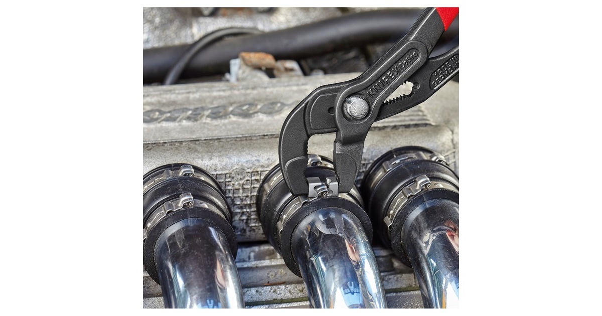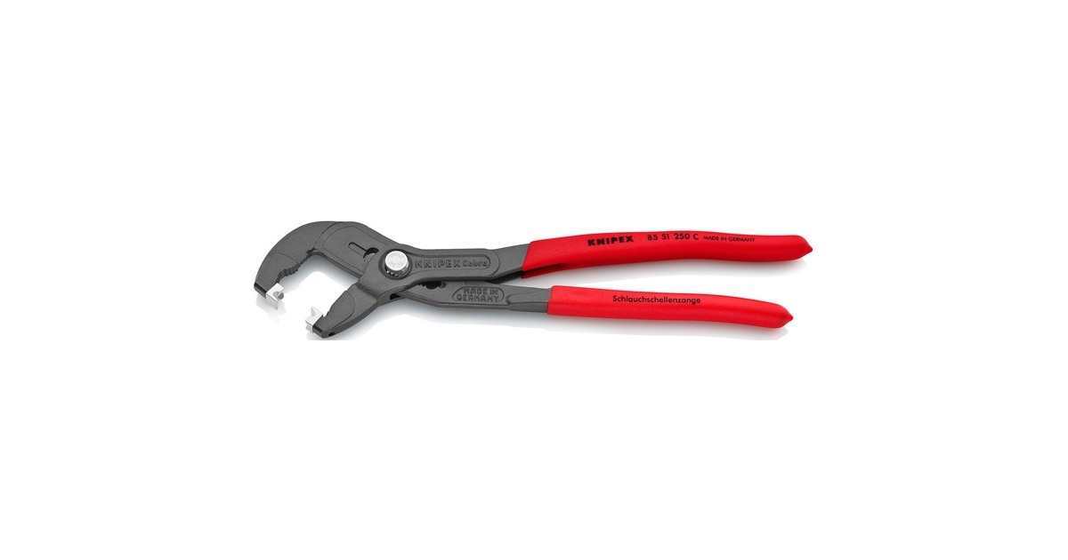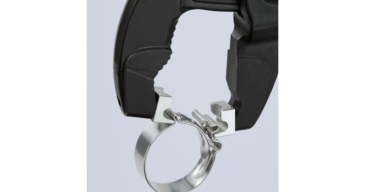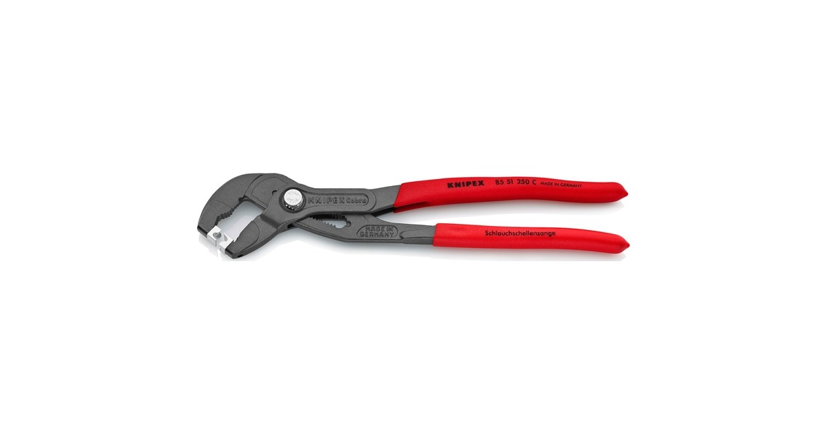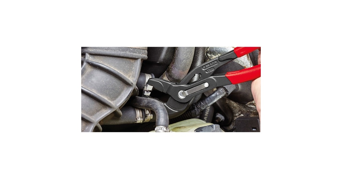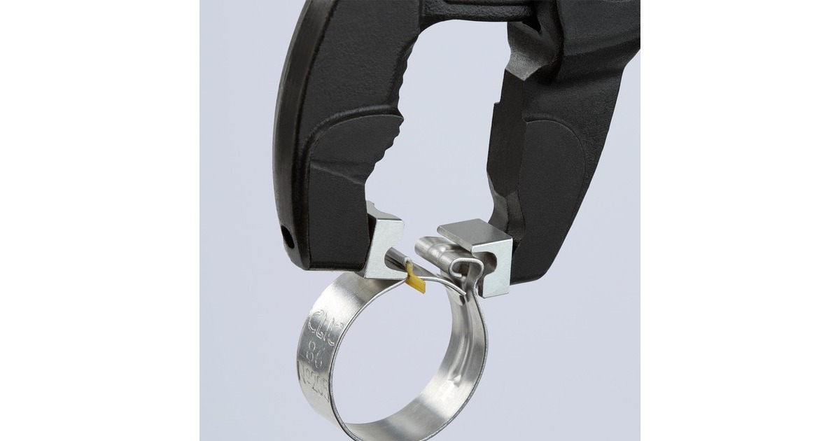 Die Schlauchschellenzange 8551250C von Knipex eignet sich zum Öffnen und Schließen von Click-Schellen. Die drehbaren Greifeinsätze ermöglichen die sichere Betätigung der Schellen in jeder Position. Dank der guten Hebelübersetzung können die Schellen einfach, ohne hohen Kraftaufwand sicher und leicht geöffnet und wieder geschlossen werden. Die Schlauchschellenzange 8551250C ist ein unentbehrlicher Helfer zum komfortablen Arbeiten z.B. an Kraftstoffschläuchen, Unterdruckleitungen oder Ansaugstutzen. Eine weitere Zusatzfunktion ist das gezahnte Greifmaul, mit dem sich Schläuche schonend lösen lassen. Der schlanke Kopf, die geringe Kopfbreite und der drehbare Greifeinsatz machen aus der Schlauchschellenzange 8551250C ein ideales Werkzeug gerade unter beengten Verhältnissen. Die Zange ist aus Chrom-Vanadin-Elektrostahl gefertigt, geschmiedet und ölgehärtet.